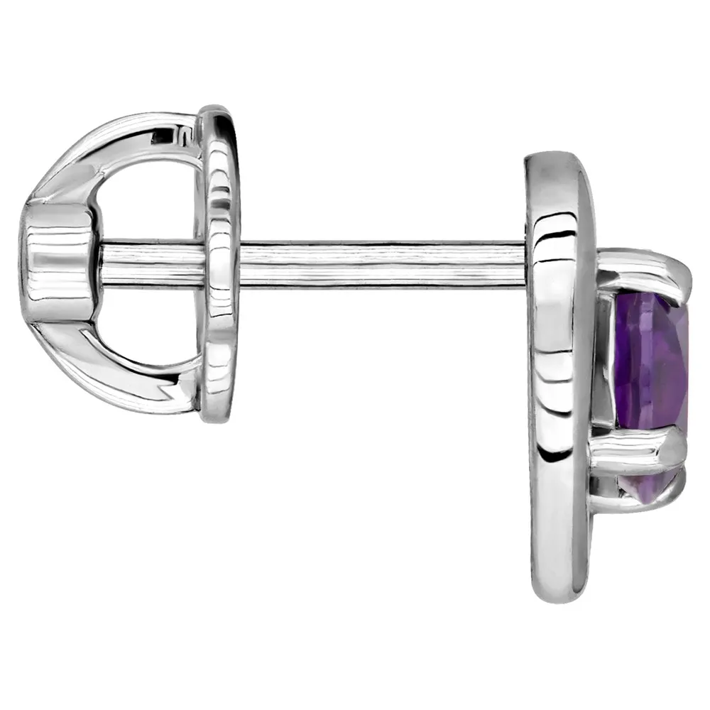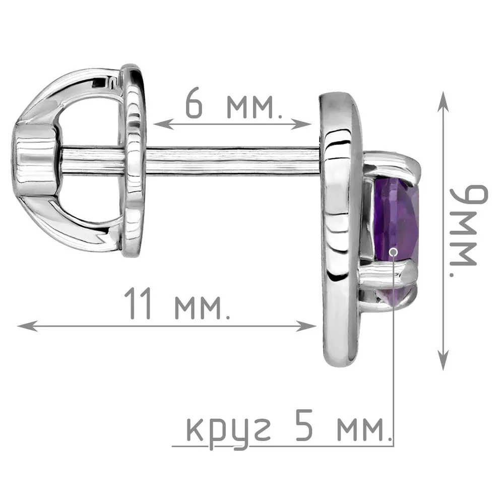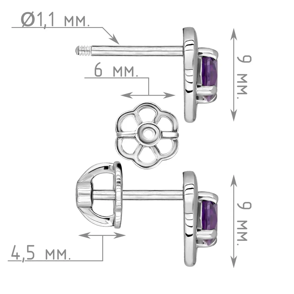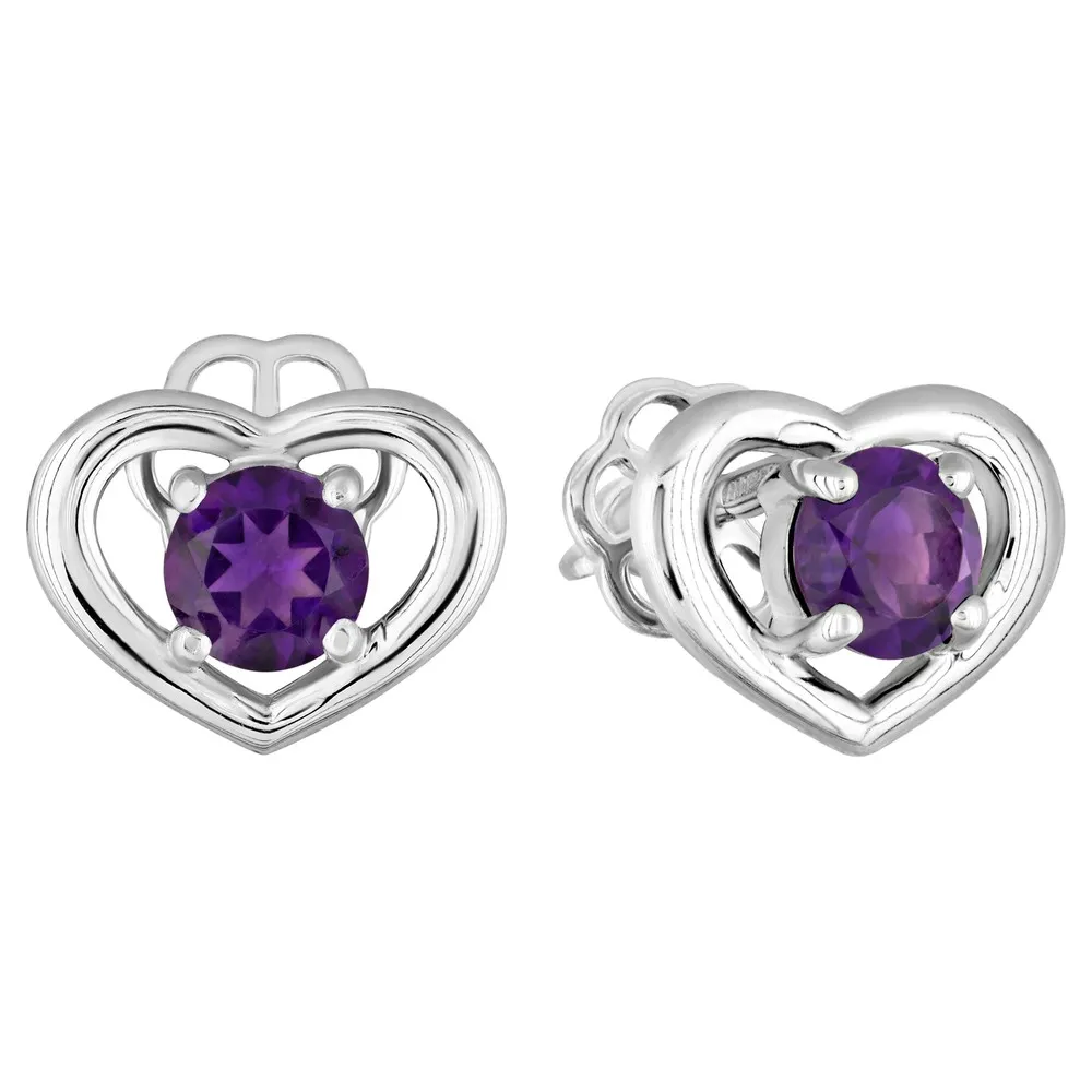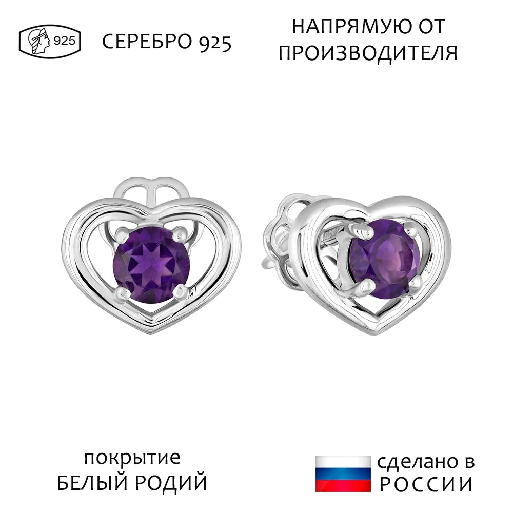 Серебряные серьги гвоздики (пусеты) с натуральным аметистом (темным) - Сердце / покрытие Белый Родий.