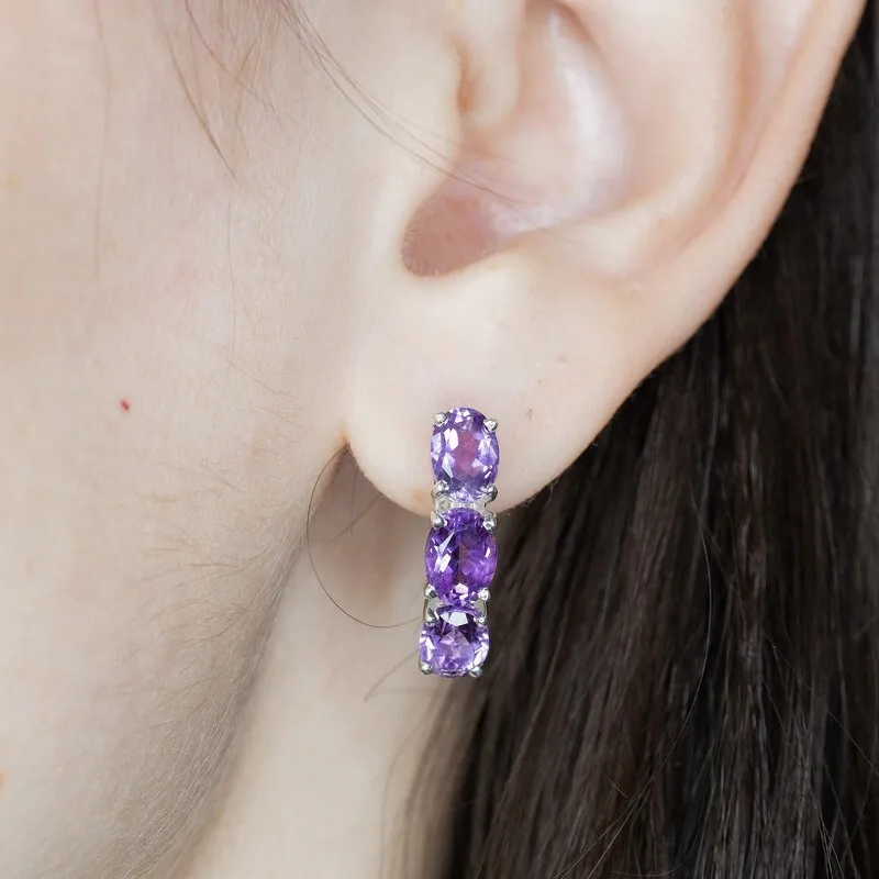 Серебряные серьги с натуральным аметистом - коллекция Муза. Средний вес изделия с камнями 2.58 гр. Месторождение(я): Аметист (Приполярный Урал, Россия) Аметист (Натуральный) овал 5*7 мм., средний вес: 0,81 карат. Размер лицевой части: 5*21 мм. Все изделия собственного производства. Арт. 7916. Аметист — прозрачный или полупрозрачный камень фиолетовых оттенков, подвид кварца. Он гармонизирует разум, снимает стресс, улучшает кровообращение, способствует умственному развитию и личностному росту. Считается, что он также оберегает от головной боли и бессонницы, служит противоядием, помогает избавиться от алкоголизма и наделяет владельца проницательностью, раскрывая «третий глаз» (за который отвечает чакра аджна). В медитации помогает расслабиться и успокоиться. Положенный под подушку, аметист приносит хорошие сны.