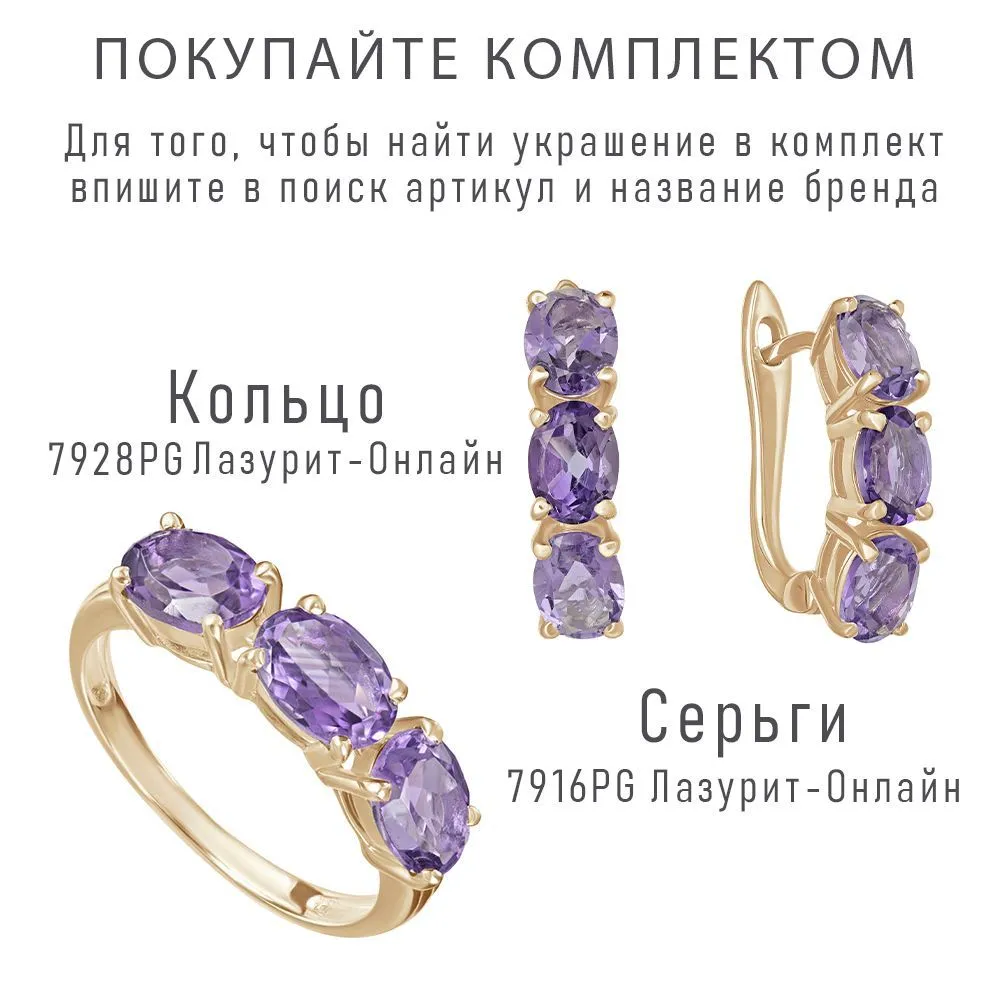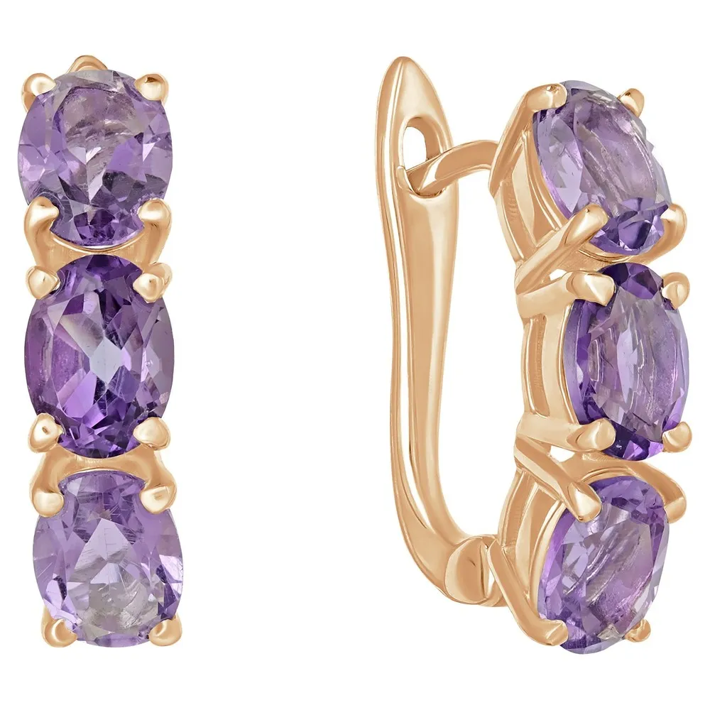 Серебряные серьги с натуральным аметистом - коллекция Муза. Серебряные серьги 925 пробы с покрытием розовое золото. Цвет покрытия соответствует швейцарскому цветовому стандарту NIHS -4N и цвету розового золота 585 в России. На последней фотографии мы разместили сравнительную фотографию 3 цвета золотого покрытия. Помимо предания золотого цвета Вашему изделию, тонкий слой золота защищает от окисления. Для более стойкого эффекта золочения и долговечности покрытия мы дополнительно наносим подслой палладия (Pd). Средний вес изделия с камнями 2.58 гр. Месторождение(я): Аметист (Приполярный Урал, Россия) Аметист (Натуральный) овал 5*7 мм., средний вес: 0,81 карат. Размер лицевой части: 5*21 мм. Все изделия собственного производства. Арт. 7916. Аметист — прозрачный или полупрозрачный камень фиолетовых оттенков, подвид кварца. Он гармонизирует разум, снимает стресс, улучшает кровообращение, способствует умственному развитию и личностному росту. Считается, что он также оберегает от головной боли и бессонницы, служит противоядием, помогает избавиться от алкоголизма и наделяет владельца проницательностью, раскрывая «третий глаз» (за который отвечает чакра аджна). В медитации помогает расслабиться и успокоиться. Положенный под подушку, аметист приносит хорошие сны.