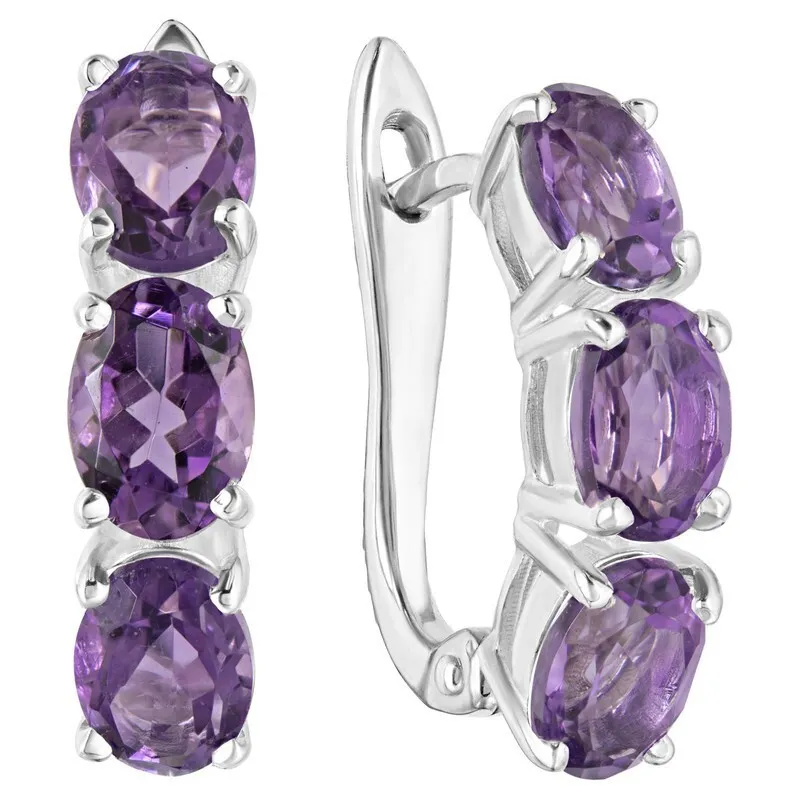 Серебряные серьги с натуральным аметистом - коллекция Муза. Средний вес изделия с камнями 2.58 гр. Месторождение(я): Аметист (Приполярный Урал, Россия) Аметист (Натуральный) овал 5*7 мм., средний вес: 0,81 карат. Размер лицевой части: 5*21 мм. Все изделия собственного производства. Арт. 7916. Аметист — прозрачный или полупрозрачный камень фиолетовых оттенков, подвид кварца. Он гармонизирует разум, снимает стресс, улучшает кровообращение, способствует умственному развитию и личностному росту. Считается, что он также оберегает от головной боли и бессонницы, служит противоядием, помогает избавиться от алкоголизма и наделяет владельца проницательностью, раскрывая «третий глаз» (за который отвечает чакра аджна). В медитации помогает расслабиться и успокоиться. Положенный под подушку, аметист приносит хорошие сны.