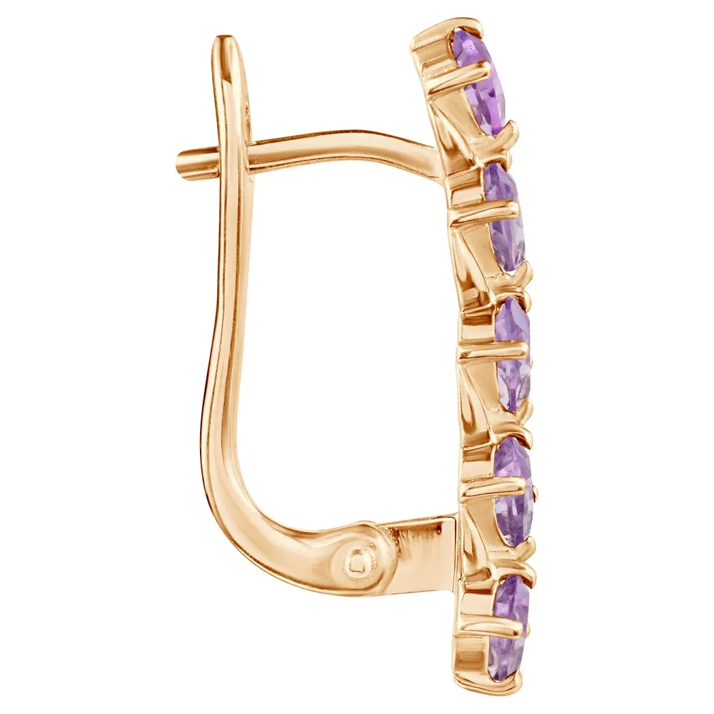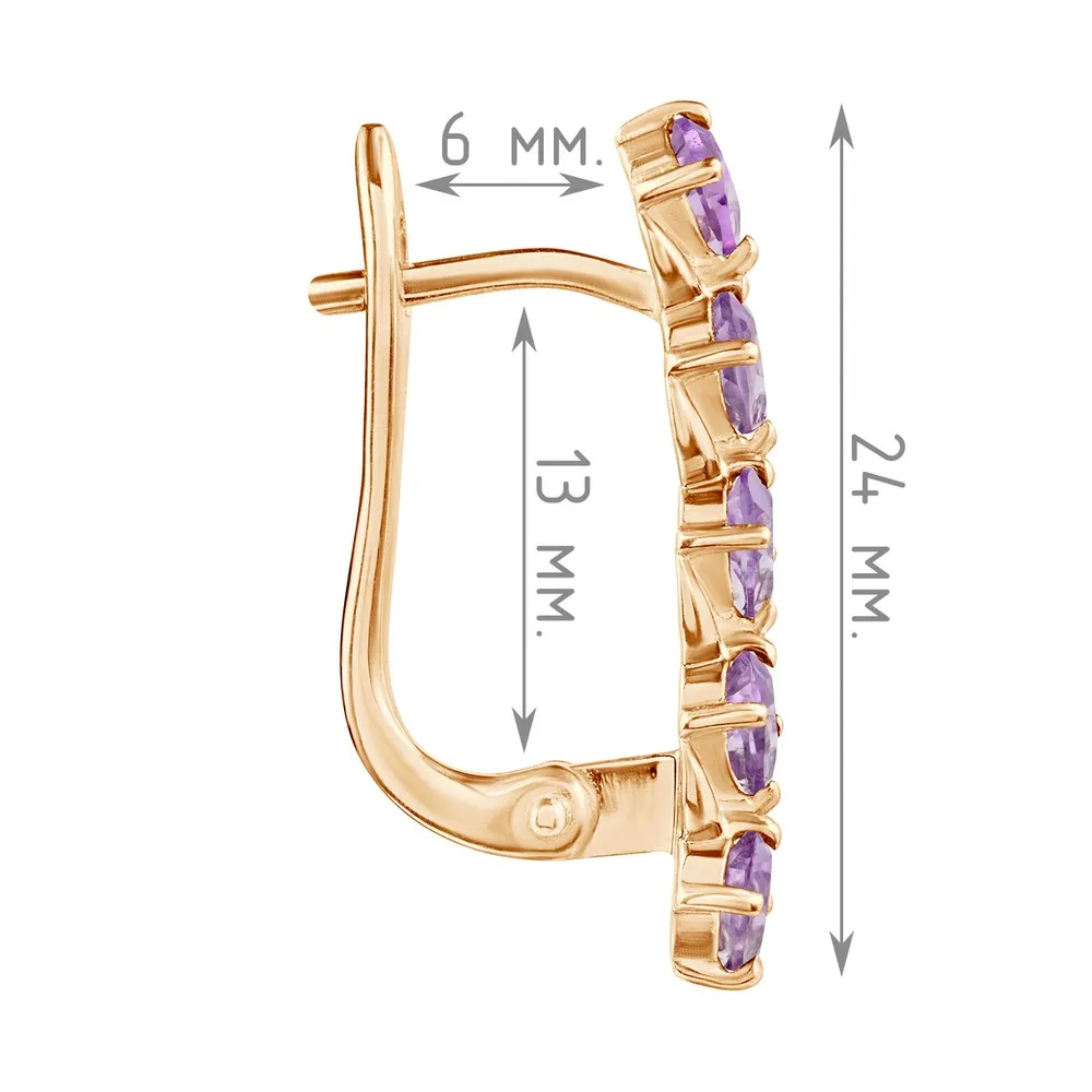 Серебряные серьги с натуральным аметистом - коллекция Колосок. Серебряные серьги 925 пробы с покрытием розовое золото. Цвет покрытия соответствует швейцарскому цветовому стандарту NIHS -4N и цвету розового золота 585 в России. На последней фотографии мы разместили сравнительную фотографию 3 цвета золотого покрытия. Помимо предания золотого цвета Вашему изделию, тонкий слой золота защищает от окисления. Для более стойкого эффекта золочения и долговечности покрытия мы дополнительно наносим подслой палладия (Pd). Средний вес изделия с камнями 4.18 гр. Месторождение: Аметист (Приполярный Урал, Россия). Аметист (Натуральный) овал 3*5 мм., средний вес: 0.22 карат. Все изделия собственного производства. Арт. 7974. Аметист — прозрачный или полупрозрачный камень фиолетовых оттенков, подвид кварца. Он гармонизирует разум, снимает стресс, улучшает кровообращение, способствует умственному развитию и личностному росту. Считается, что он также оберегает от головной боли и бессонницы, служит противоядием, помогает избавиться от алкоголизма и наделяет владельца проницательностью, раскрывая «третий глаз» (за который отвечает чакра аджна). В медитации помогает расслабиться и успокоиться. Положенный под подушку, аметист приносит хорошие сны.
