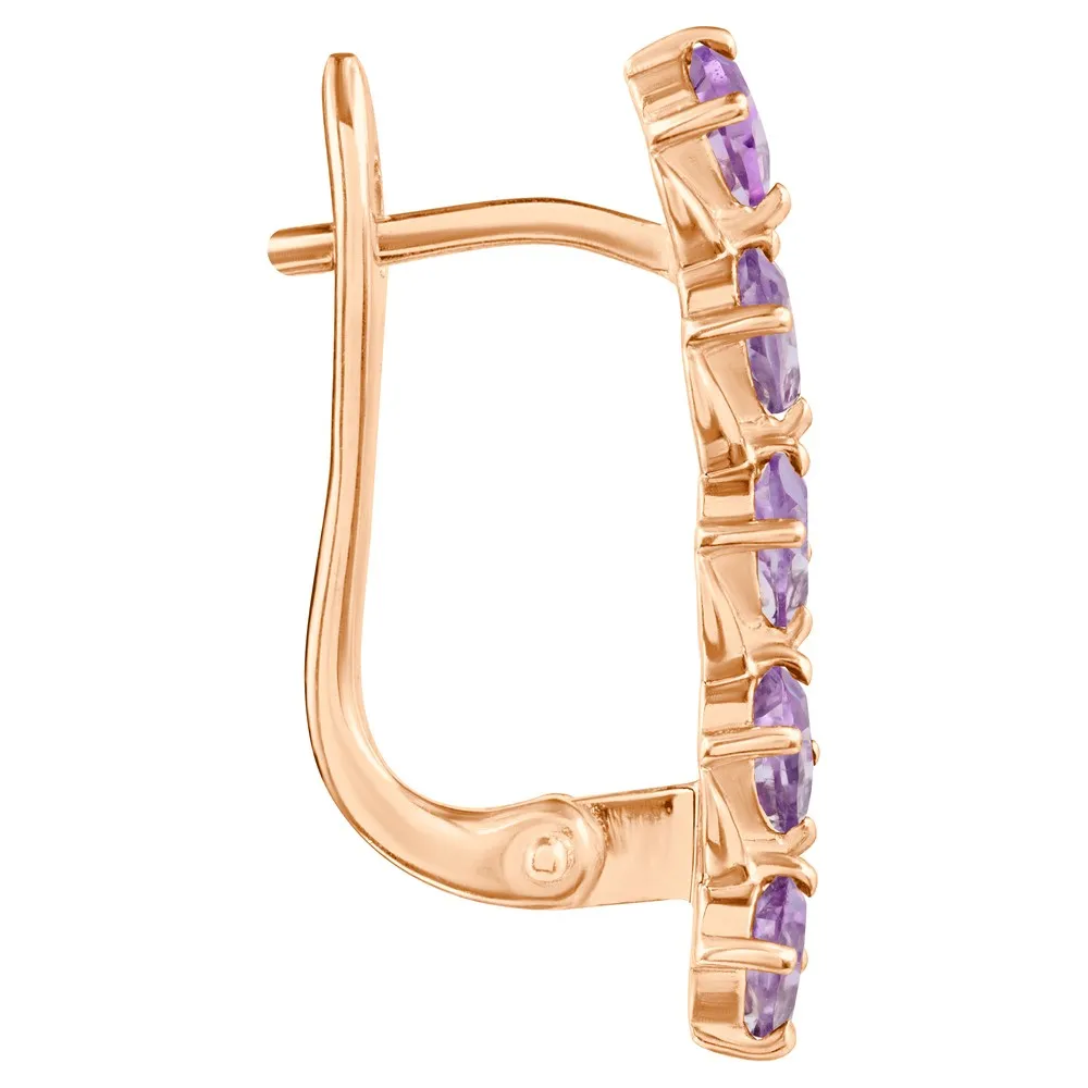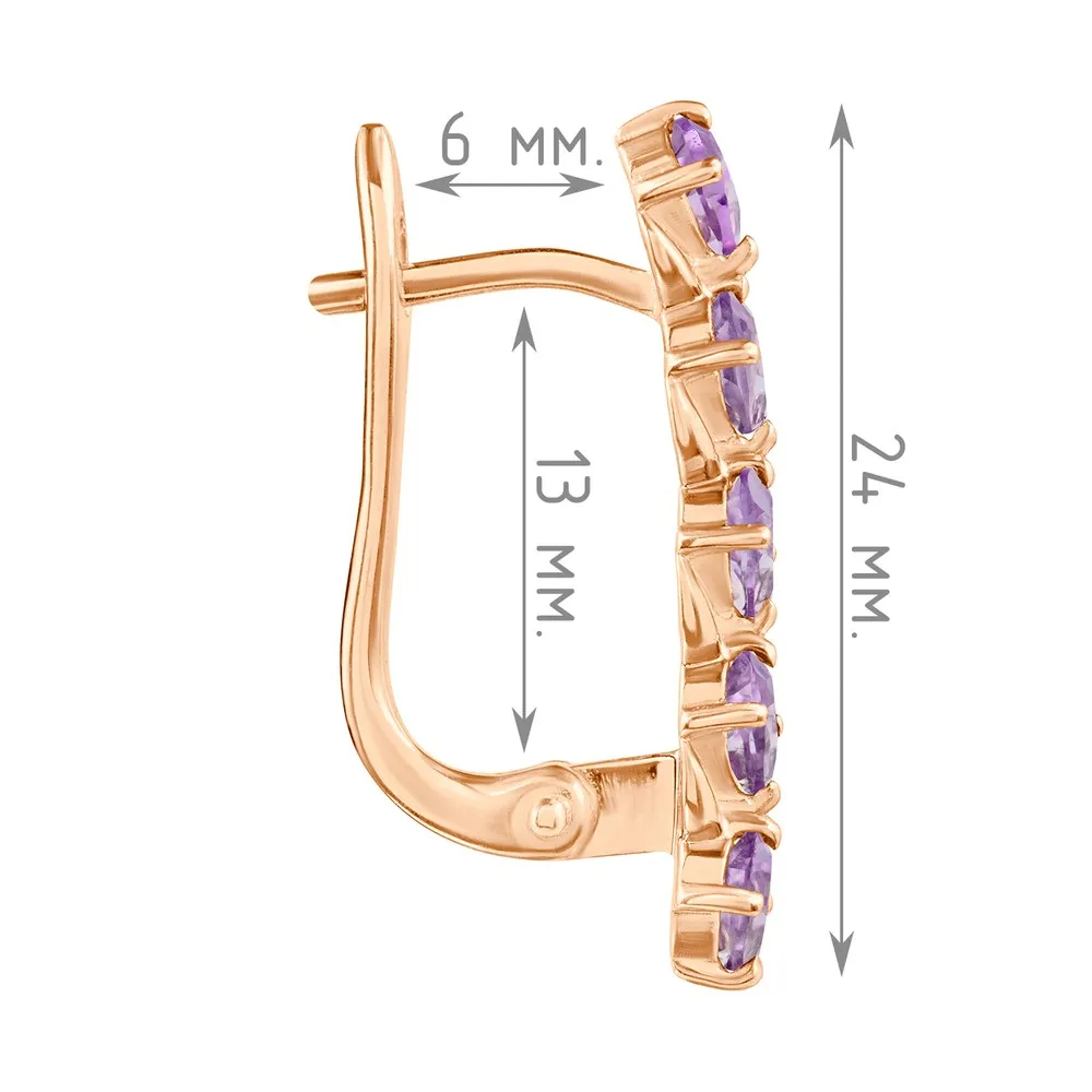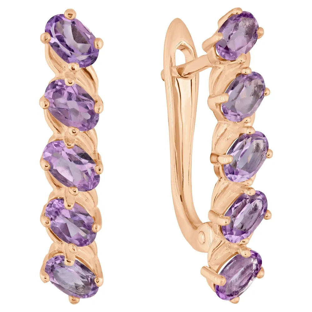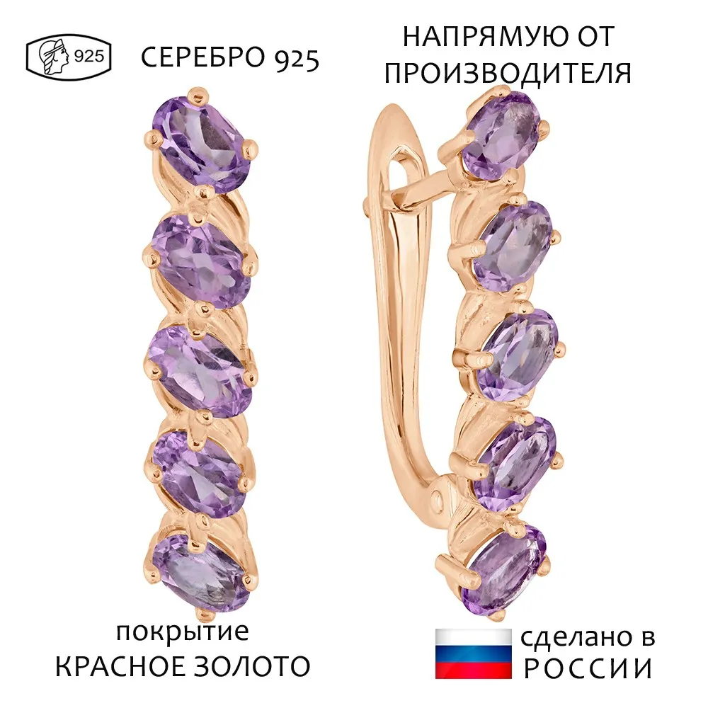Серебряные серьги с натуральным аметистом - коллекция Колосок. Серебряные серьги 925 пробы с покрытием красное золото. Цвет покрытия соответствует швейцарскому цветовому стандарту NIHS -5N и цвету красного золота 585 в России. На последней фотографии мы разместили сравнительную фотографию 3 цвета золотого покрытия. Помимо предания золотого цвета Вашему изделию, тонкий слой золота защищает от окисления. Для более стойкого эффекта золочения и долговечности покрытия мы дополнительно наносим подслой палладия (Pd). Средний вес изделия с камнями 4.18 гр. Месторождение: Аметист (Приполярный Урал, Россия). Аметист (Натуральный) овал 3*5 мм., средний вес: 0.22 карат. Все изделия собственного производства. Арт. 7974. Аметист — прозрачный или полупрозрачный камень фиолетовых оттенков, подвид кварца. Он гармонизирует разум, снимает стресс, улучшает кровообращение, способствует умственному развитию и личностному росту. Считается, что он также оберегает от головной боли и бессонницы, служит противоядием, помогает избавиться от алкоголизма и наделяет владельца проницательностью, раскрывая «третий глаз» (за который отвечает чакра аджна). В медитации помогает расслабиться и успокоиться. Положенный под подушку, аметист приносит хорошие сны.