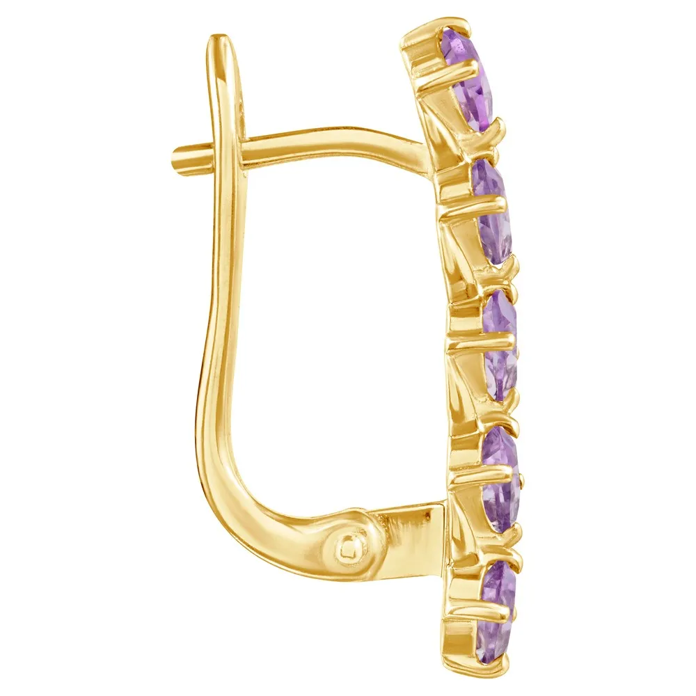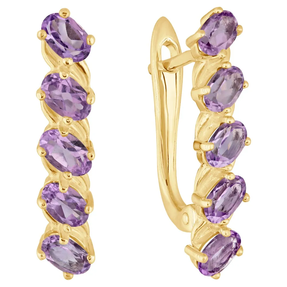 Серебряные серьги с натуральным аметистом - коллекция Колосок. Серебряные серьги 925 пробы с покрытием желтое золото. Цвет покрытия соответствует швейцарскому цветовому стандарту NIHS -FF24ct и цвету чистого золото 999.99. На последней фотографии мы разместили сравнительную фотографию 3 цвета золотого покрытия. Помимо предания золотого цвета Вашему изделию, тонкий слой золота защищает от окисления. Для более стойкого эффекта золочения и долговечности покрытия мы дополнительно наносим подслой палладия (Pd). Средний вес изделия с камнями 4.18 гр. Месторождение: Аметист (Приполярный Урал, Россия). Аметист (Натуральный) овал 3*5 мм., средний вес: 0.22 карат. Все изделия собственного производства. Арт. 7974. Аметист — прозрачный или полупрозрачный камень фиолетовых оттенков, подвид кварца. Он гармонизирует разум, снимает стресс, улучшает кровообращение, способствует умственному развитию и личностному росту. Считается, что он также оберегает от головной боли и бессонницы, служит противоядием, помогает избавиться от алкоголизма и наделяет владельца проницательностью, раскрывая «третий глаз» (за который отвечает чакра аджна). В медитации помогает расслабиться и успокоиться. Положенный под подушку, аметист приносит хорошие сны.