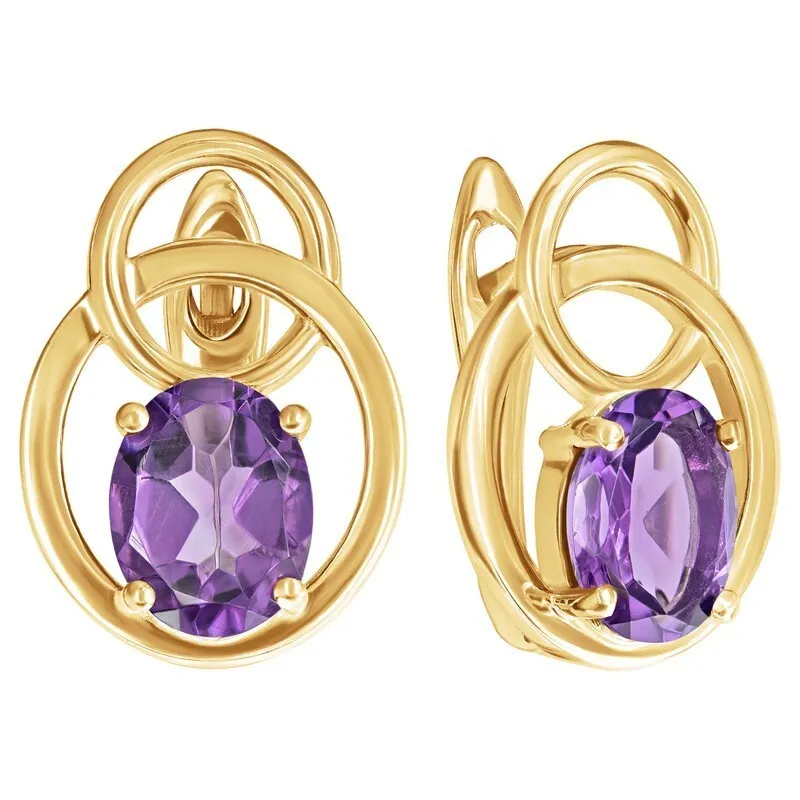 Серебряные серьги с натуральным аметистом - коллекция Юнона. Серебряные серьги 925 пробы с покрытием желтое золото. Цвет покрытия соответствует швейцарскому цветовому стандарту NIHS -FF24ct и цвету чистого золото 999.99. На последней фотографии мы разместили сравнительную фотографию 3 цвета золотого покрытия. Помимо предания золотого цвета Вашему изделию, тонкий слой золота защищает от окисления. Для более стойкого эффекта золочения и долговечности покрытия мы дополнительно наносим подслой палладия (Pd). Средний вес изделия с камнями 4.1 гр. Месторождение: Аметист (Приполярный Урал, Россия). Аметист (Натуральный) овал 6*8 мм., средний вес: 1.29 карат. Все изделия собственного производства. Гарантия 12 месяцев.Арт. 8398.