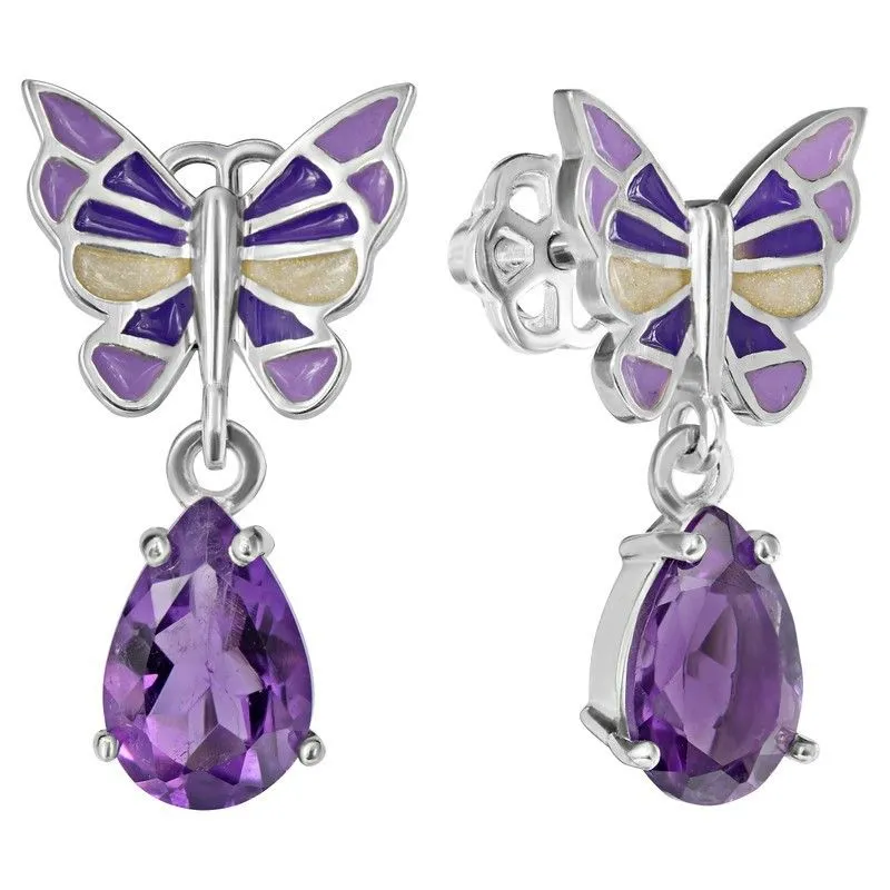 Серебряные серьги с натуральным аметистом и эмалью - коллекция Бабочка, покрытие Белый Родий. Средний вес украшения с камнями 3.44 гр. Месторождение: Аметист (Приполярный Урал, Россия). Аметист (Натуральный) груша 6*9 мм., средний вес: 1.24 карат. Все изделия собственного производства и имеют гарантию 12 месяцев, к каждому изделию прилагается паспорт. Арт. 8439WR.