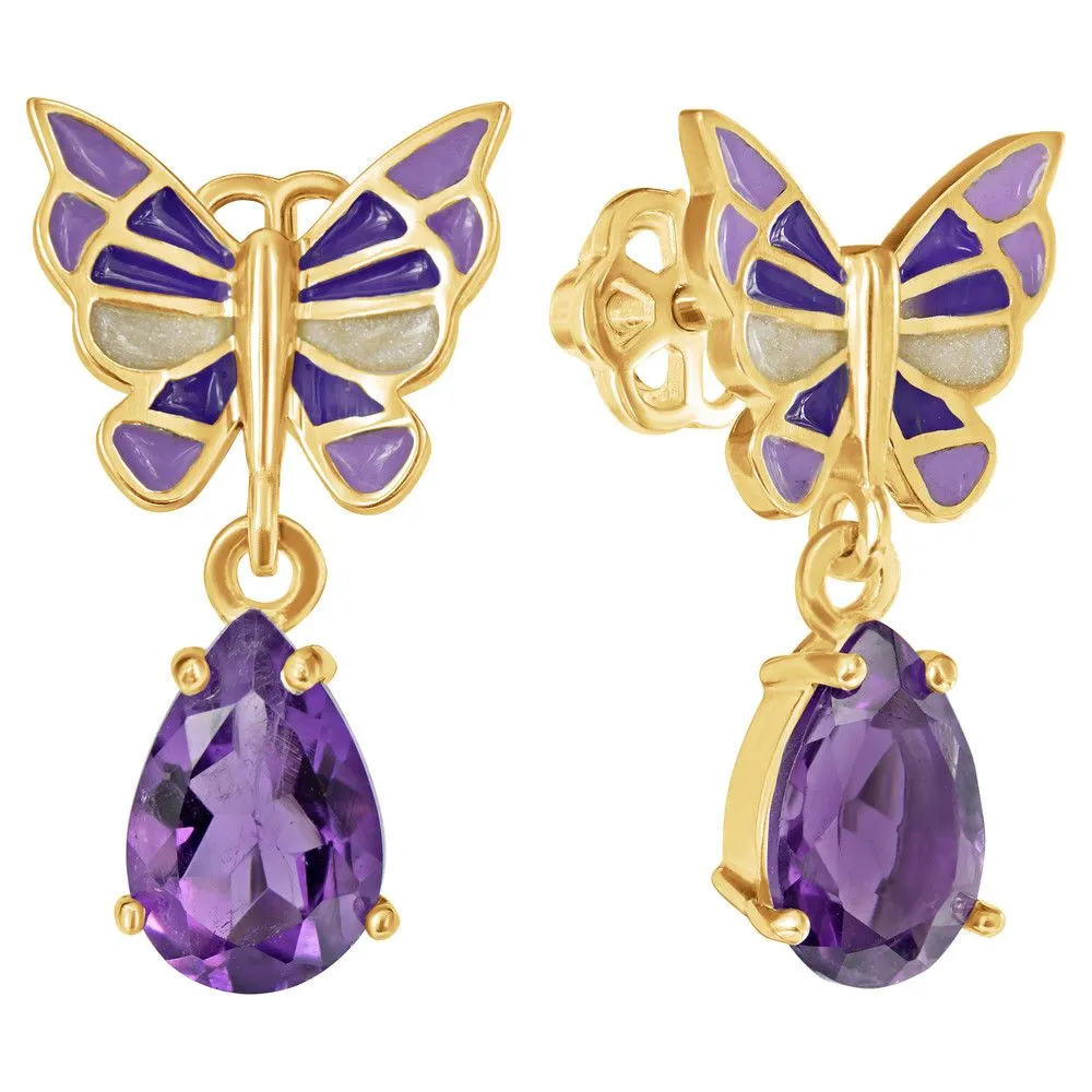 Серебряные серьги с натуральным аметистом и эмалью - коллекция Бабочка, покрытие Желтое Золото. Средний вес украшения с камнями 3.44 гр. Месторождение: Аметист (Приполярный Урал, Россия). Аметист (Натуральный) груша 6*9 мм., средний вес: 1.24 карат. Все изделия собственного производства и имеют гарантию 12 месяцев, к каждому изделию прилагается паспорт. Арт. 8439YG.