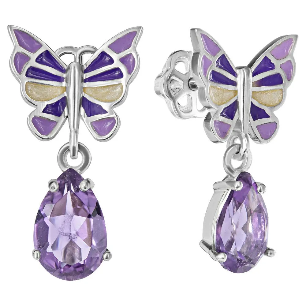 Серебряные серьги с натуральным аметистом (светлым) и эмалью - коллекция Бабочка, покрытие Чистое Серебро. Средний вес украшения с камнями 3.49 гр. Месторождение: Аметист (Приполярный Урал, Россия). Аметист (Натуральный) груша 6*9 мм., средний вес: 1.24 карат. Все изделия собственного производства и имеют гарантию 12 месяцев, к каждому изделию прилагается паспорт. Арт. 8440AG.