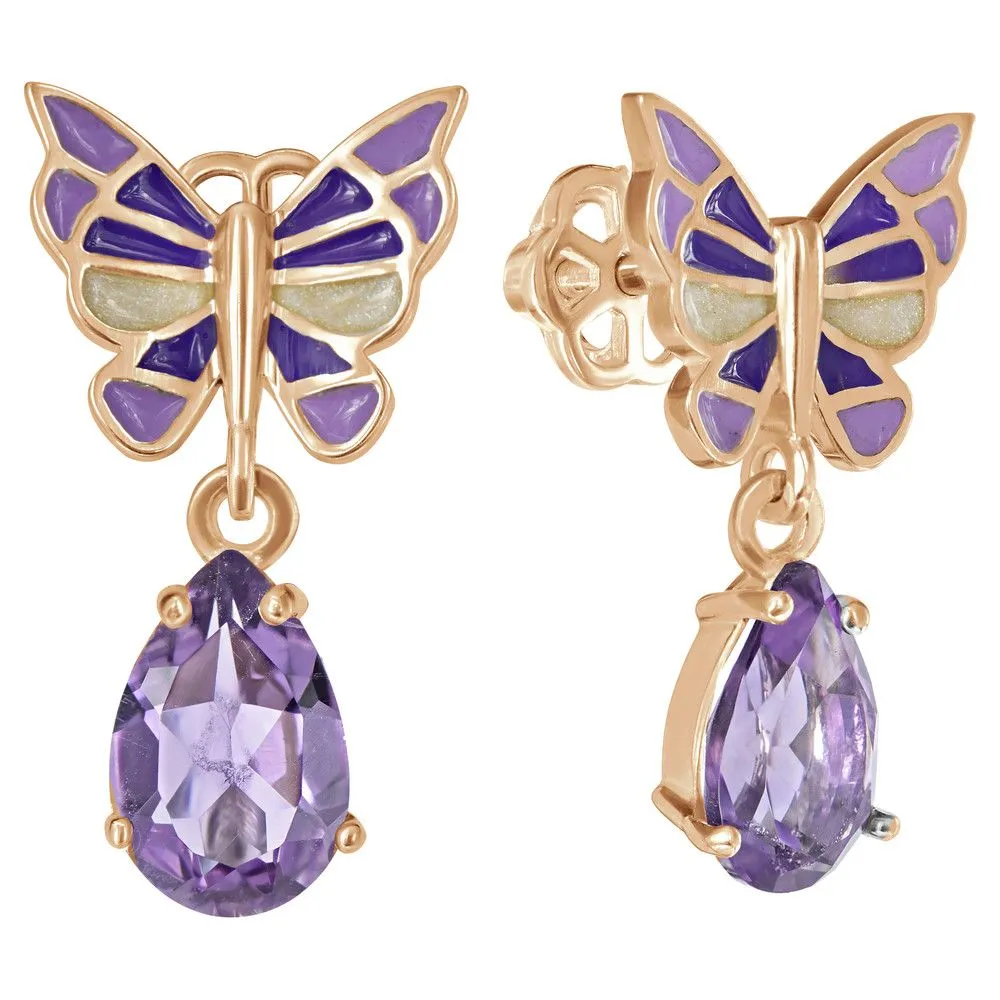 Серебряные серьги с натуральным аметистом (светлым) и эмалью - коллекция Бабочка, покрытие Розовое Золото. Средний вес украшения с камнями 3.49 гр. Месторождение: Аметист (Приполярный Урал, Россия). Аметист (Натуральный) груша 6*9 мм., средний вес: 1.24 карат. Все изделия собственного производства и имеют гарантию 12 месяцев, к каждому изделию прилагается паспорт. Арт. 8440PG.