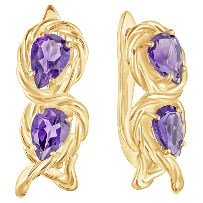 Серебряные серьги с натуральным аметистом (темным) - коллекция Ривьера / покрытие Желтое Золото
