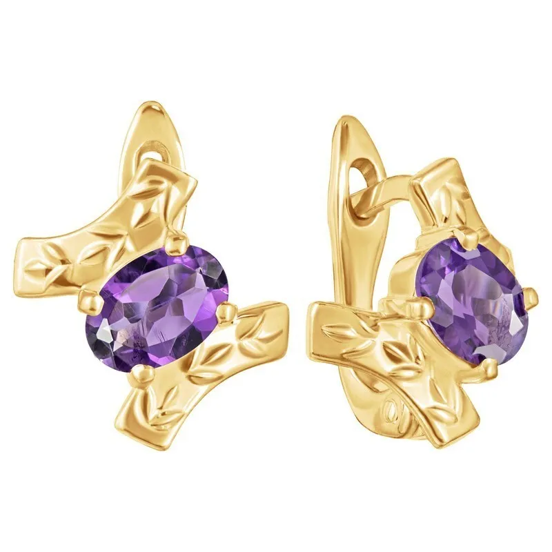 Серебряные серьги с натуральным аметистом (темным) - коллекция Тея / покрытие Желтое Золото