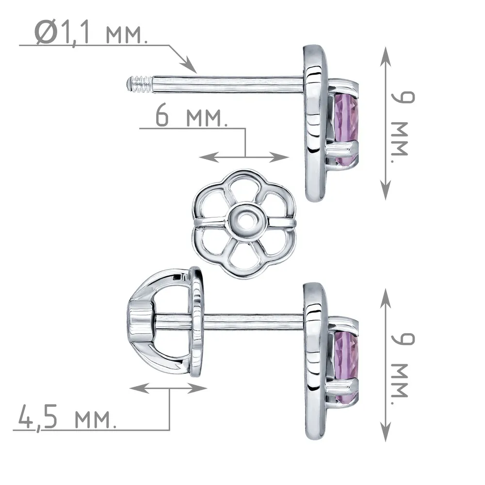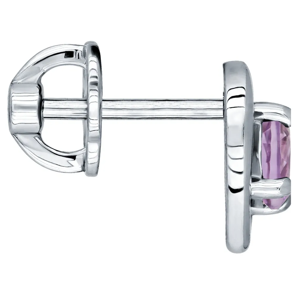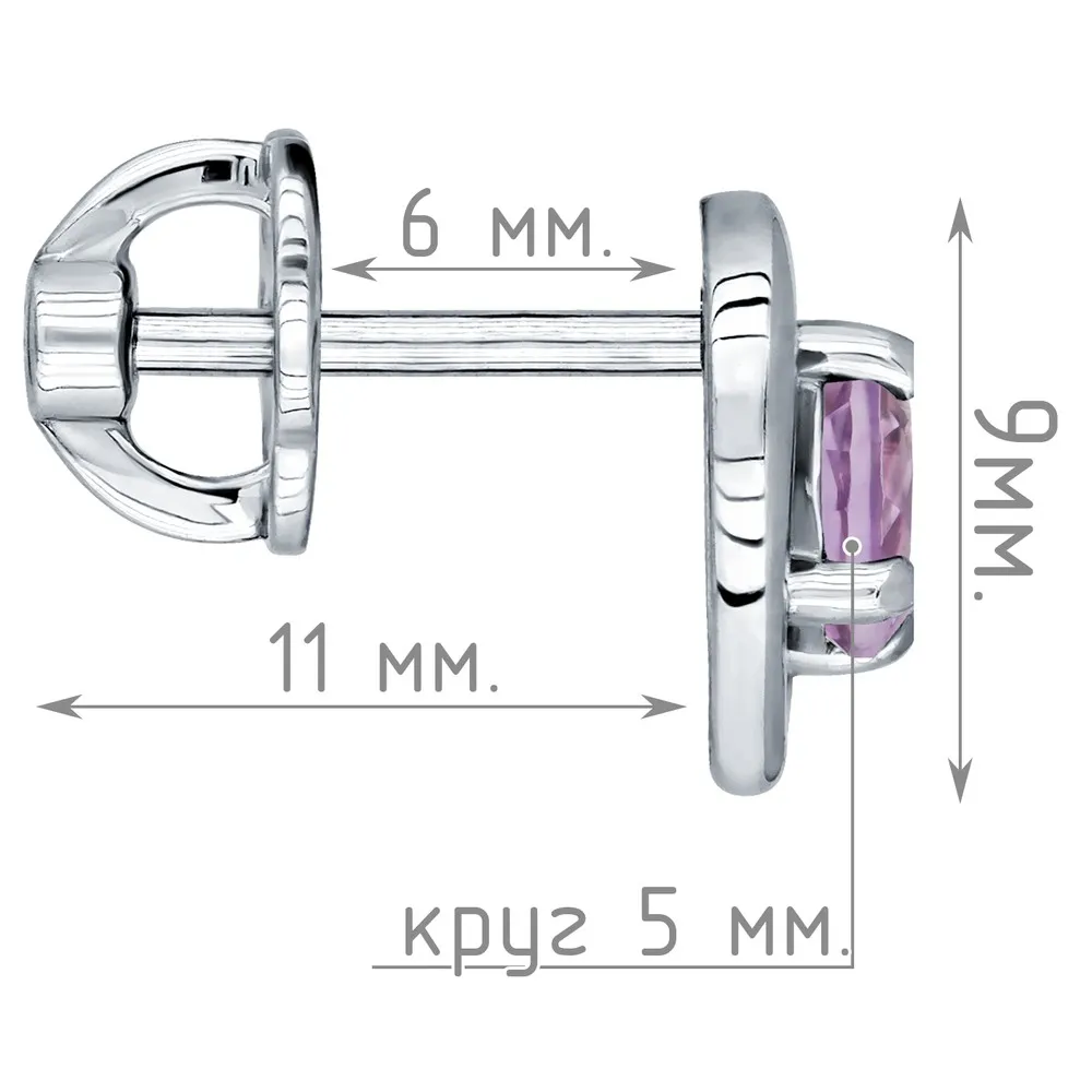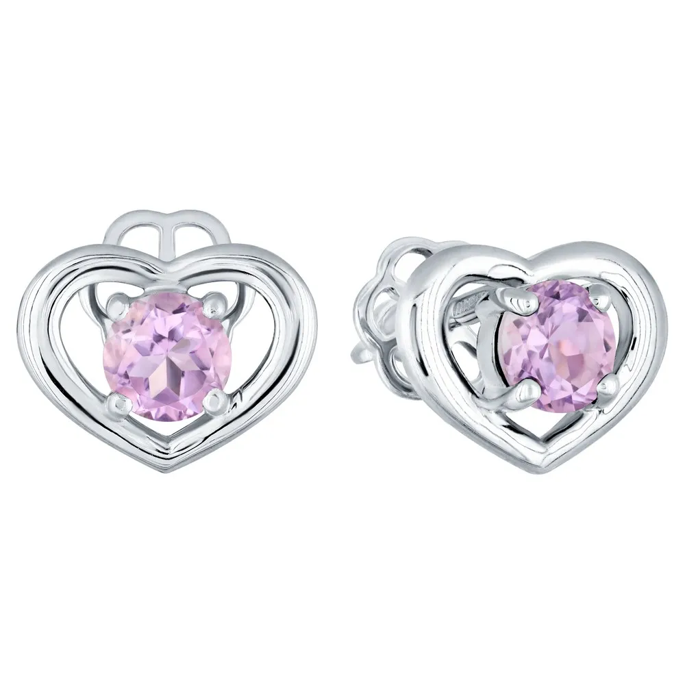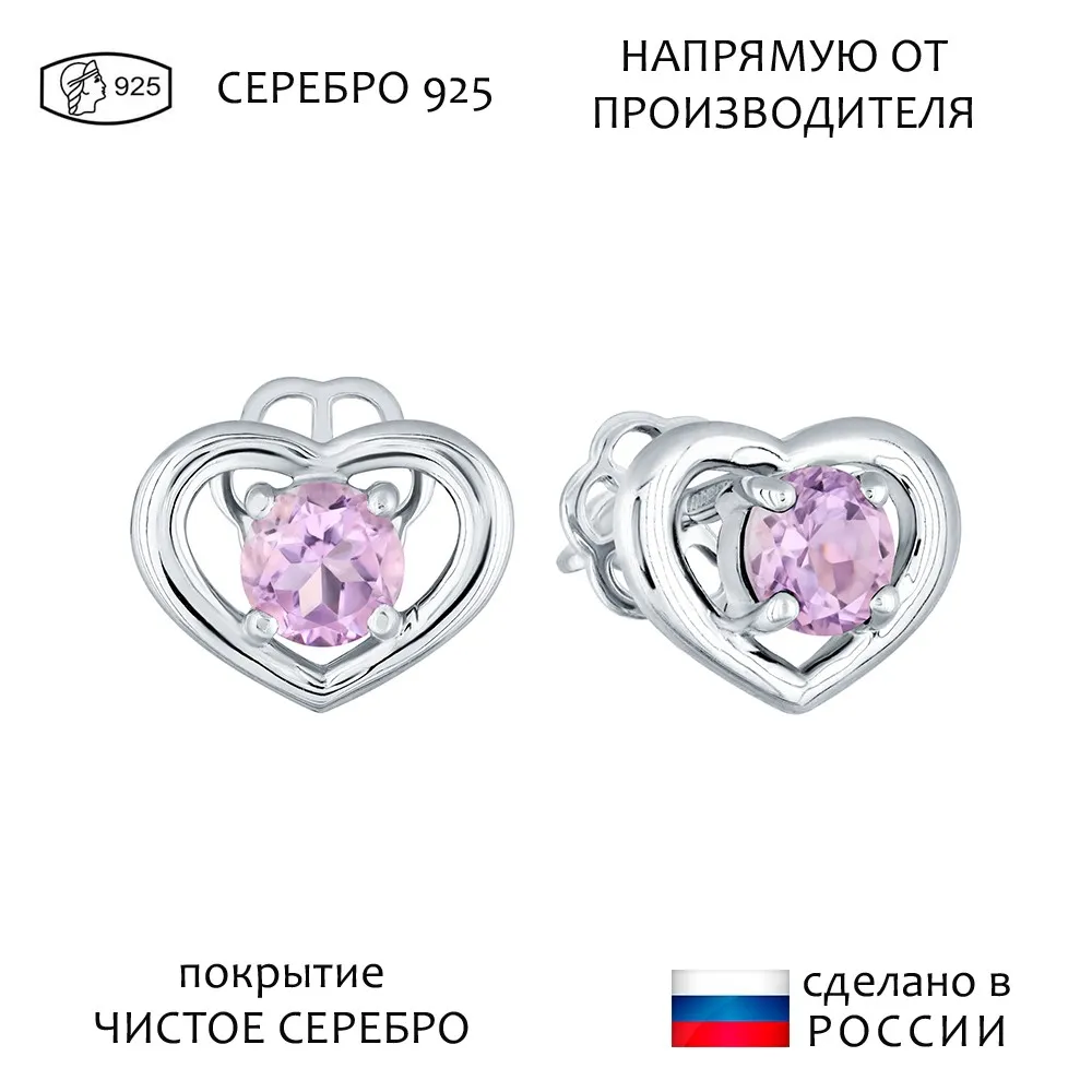 Серебряные серьги гвоздики (пусеты) с натуральным аметистом (светлым) - Сердце / покрытие Чистое Серебро.