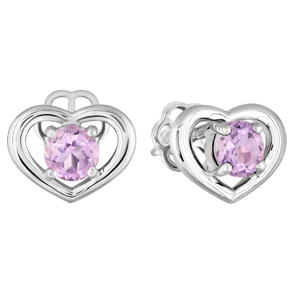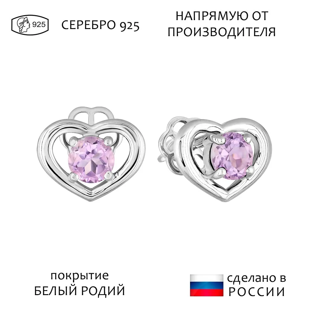 Серебряные серьги гвоздики (пусеты) с натуральным аметистом (светлым) - Сердце / покрытие Белый Родий.