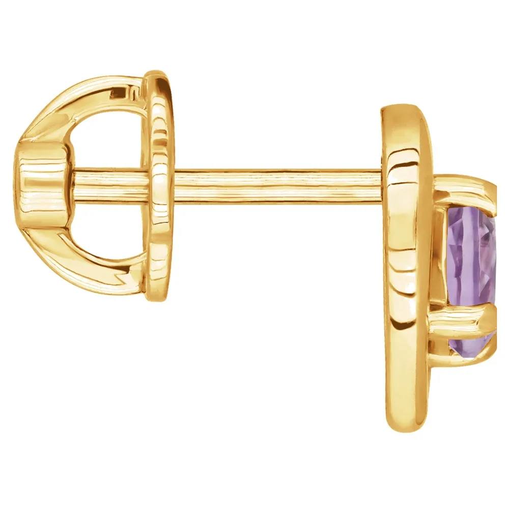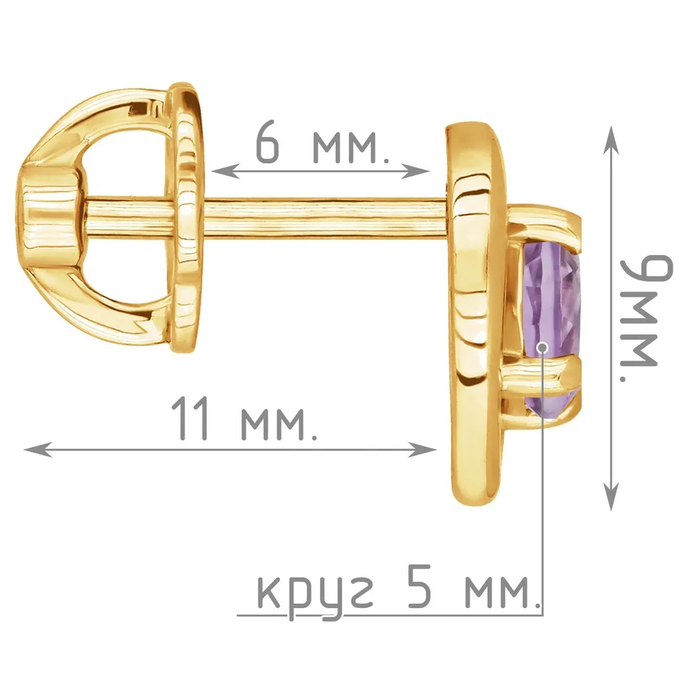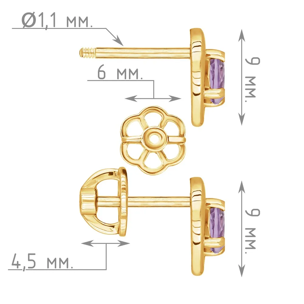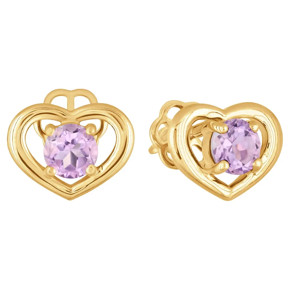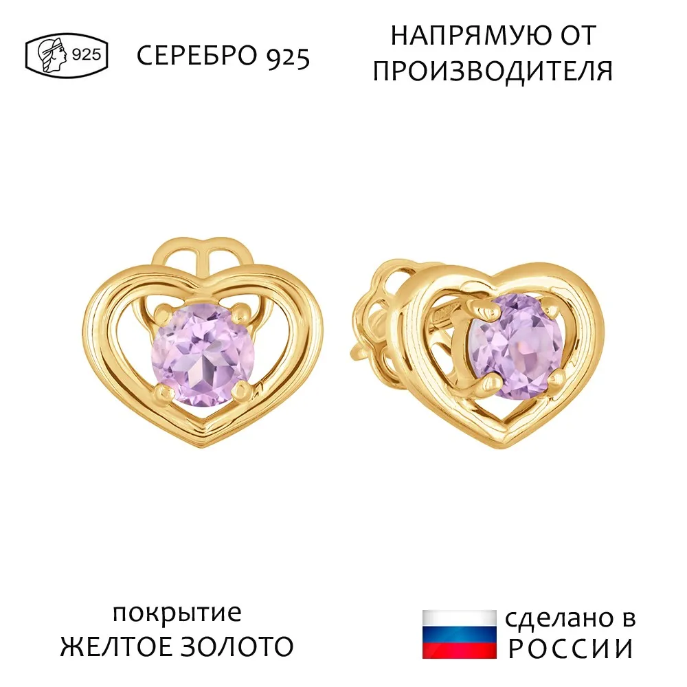 Серебряные серьги гвоздики (пусеты) с натуральным аметистом (светлым) - Сердце / покрытие Желтое Золото.