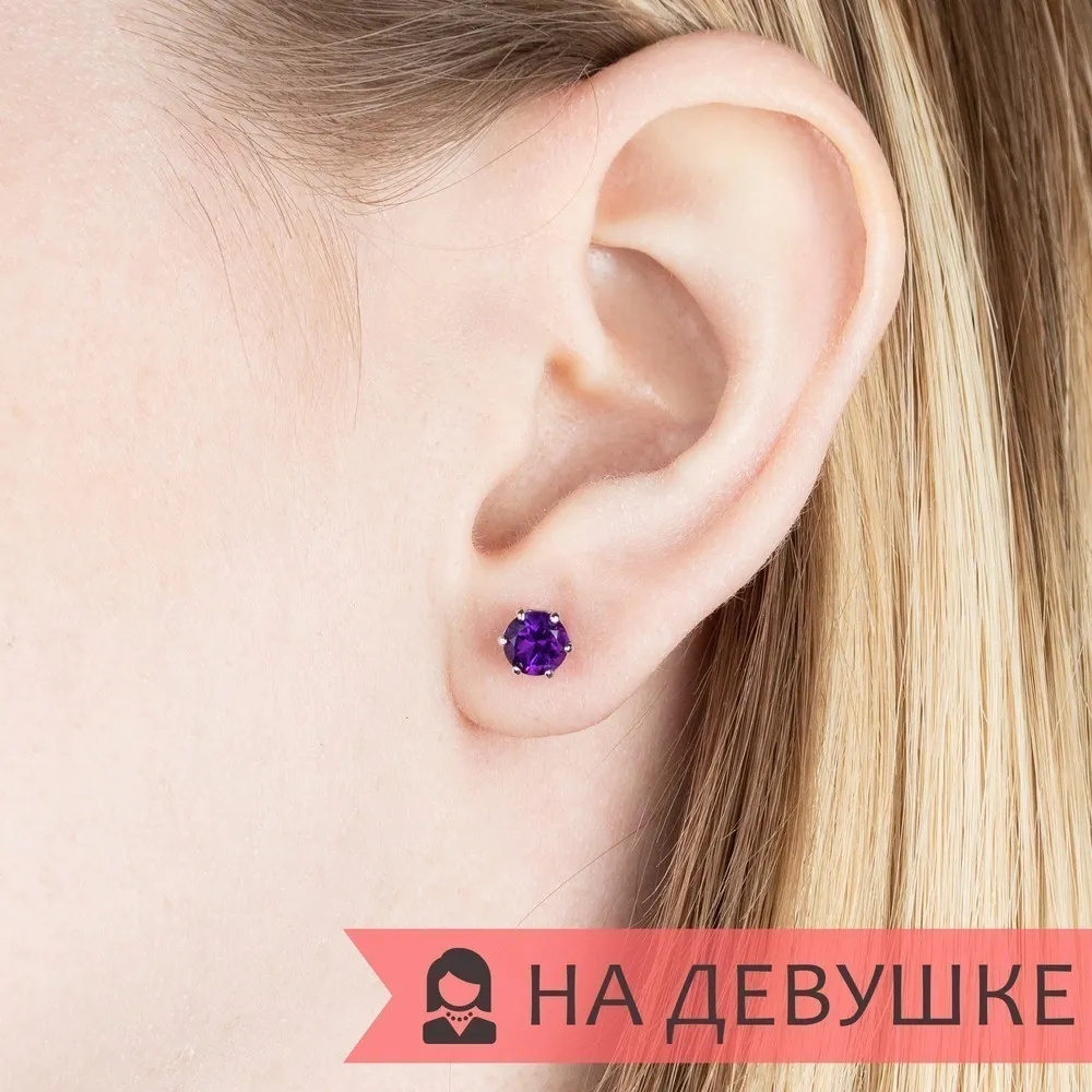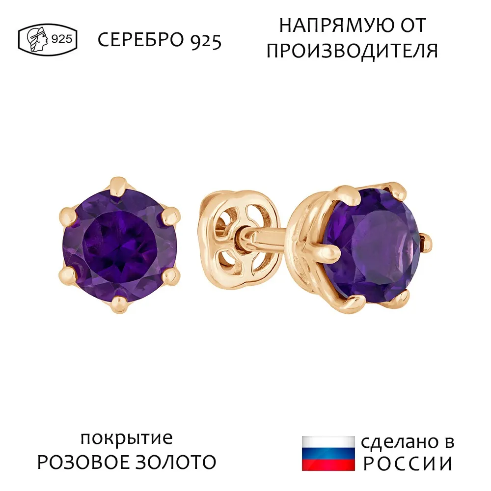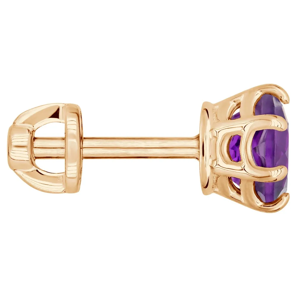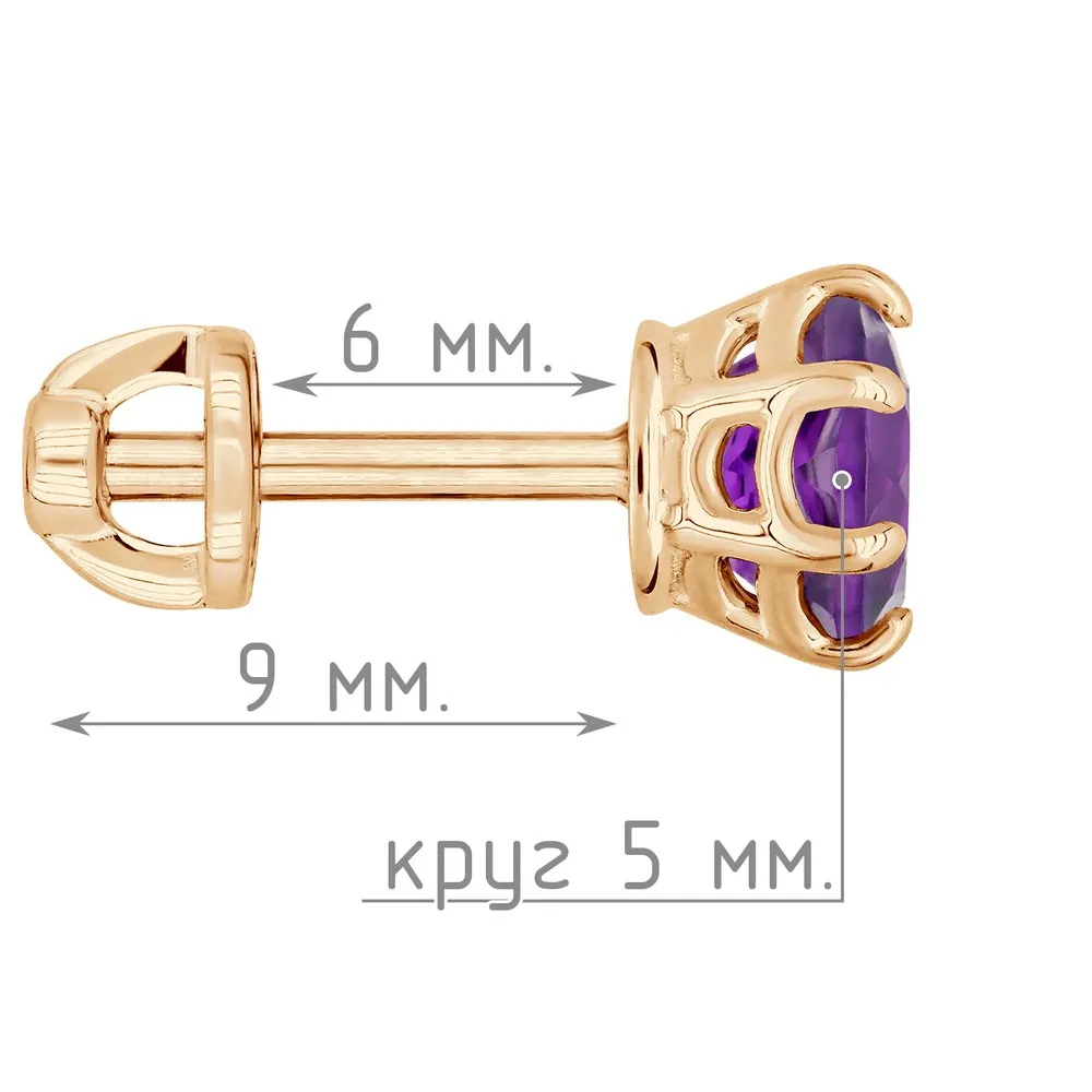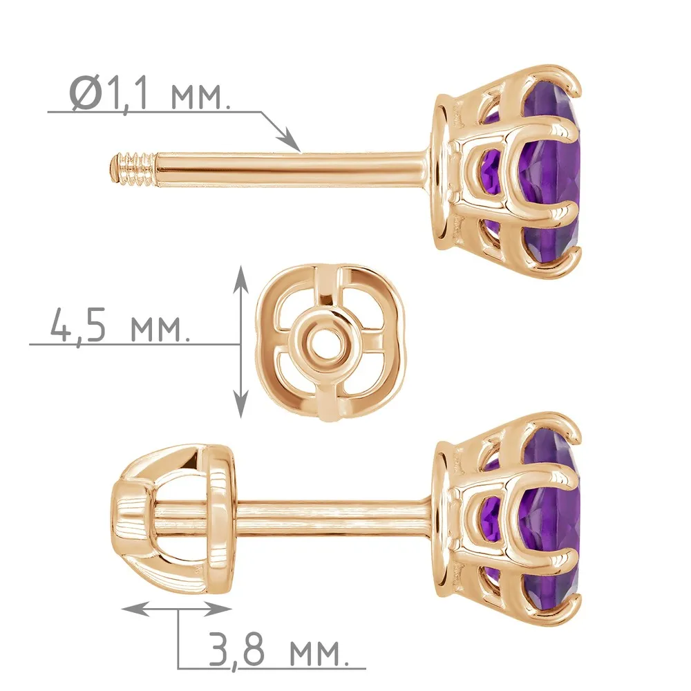 Серебряные серьги гвоздики (пусеты) с натуральным аметистом (темным) 5 мм. / Розовое Золото.
