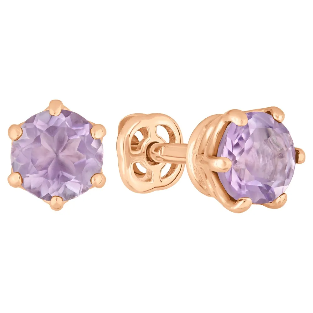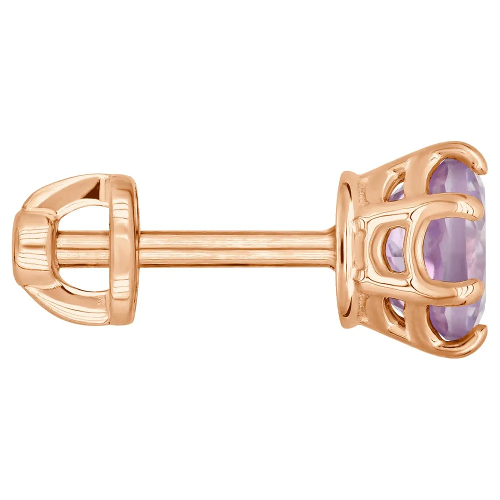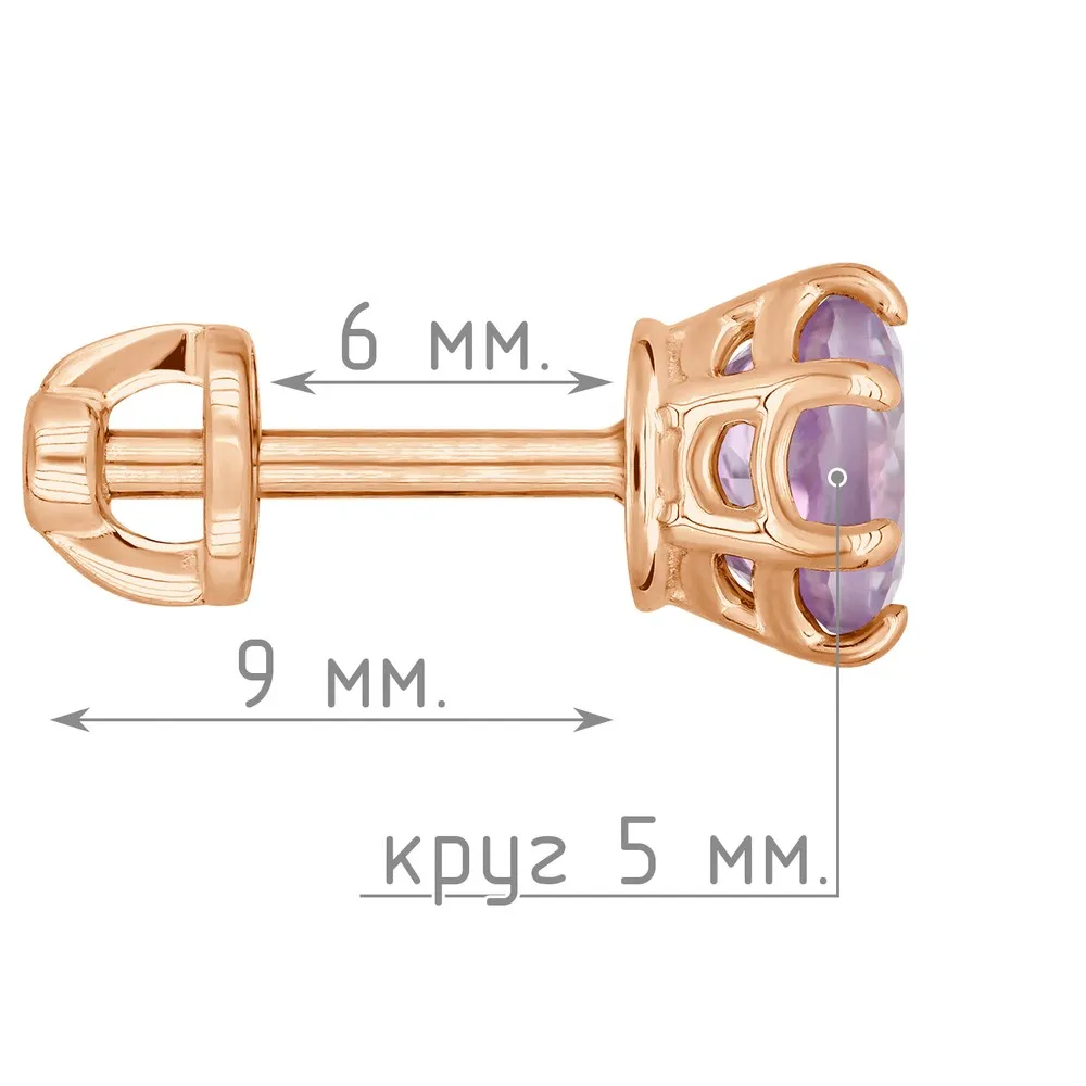 Серебряные серьги гвоздики (пусеты) с натуральным аметистом (светлым) 5 мм. / Красное золото.