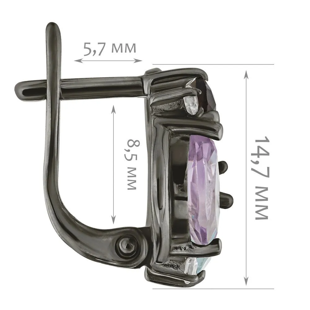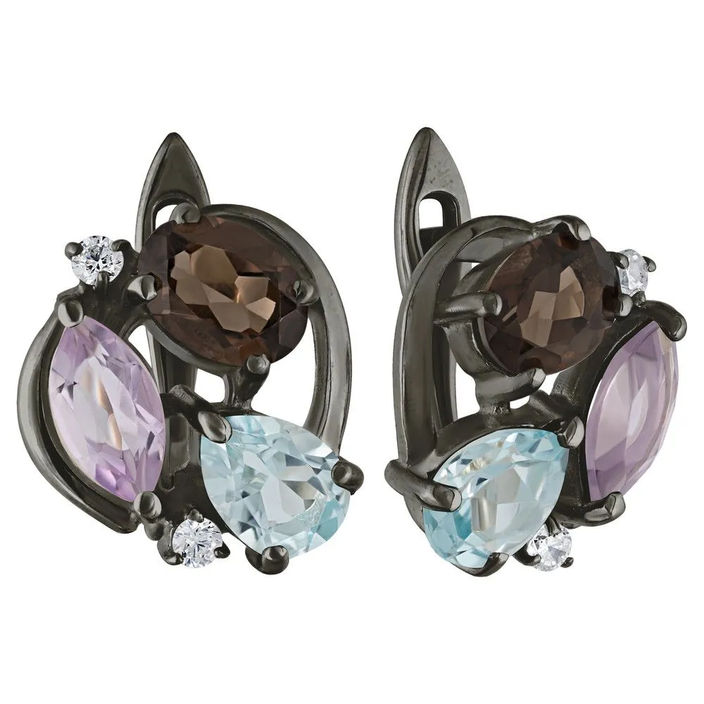 Серебряные серьги Фортуна с натуральными камнями раухтопаз, голубой топаз и аметист, покрытие Черный Родий. Средний вес украшения с камнями 5,64 гр. Месторождение(я) камней: Раухтопаз (Дымчатый кварц) (м-ние Додо ХМАО, Россия), Топаз (Ильменские горы, Россия), Аметист (Приполярный Урал, Россия). Аметист (Натуральный) маркиз: 4*8 мм., средний вес 0,50 карат.