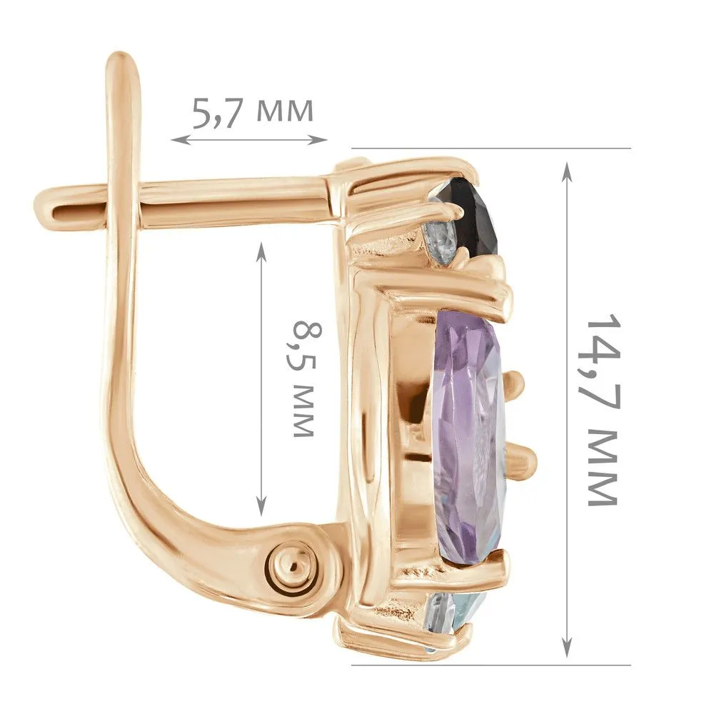 Серебряные серьги Фортуна с натуральными камнями раухтопаз, голубой топаз и аметист, покрытие Розовое Золото. Средний вес украшения с камнями 5,64 гр. Месторождение(я) камней: Раухтопаз (Дымчатый кварц) (м-ние Додо ХМАО, Россия), Топаз (Ильменские горы, Россия), Аметист (Приполярный Урал, Россия). Аметист (Натуральный) маркиз: 4*8 мм., средний вес 0,50 карат. Раухтопаз (Натуральный) овал: 5*7 мм., средний вес 0,80 карат. Топаз (Натуральный) груша: 5*7 мм., средний вес 0,80 карат. Циркон белый (Натуральный) круг: 2 мм., средний вес 0,05 карат. Размер лицевой части: 13*14 мм. Все изделия собственного производства и имеют гарантию 12 месяцев. Арт. 6679PG . Аметист — прозрачный или полупрозрачный камень фиолетовых оттенков, подвид кварца. Он гармонизирует разум, снимает стресс, улучшает кровообращение, способствует умственному развитию и личностному росту. Считается, что он также оберегает от головной боли и бессонницы, служит противоядием, помогает избавиться от алкоголизма и наделяет владельца проницательностью, раскрывая «третий глаз» (за который отвечает чакра аджна). В медитации помогает расслабиться и успокоиться. Положенный под подушку, аметист приносит хорошие сны.