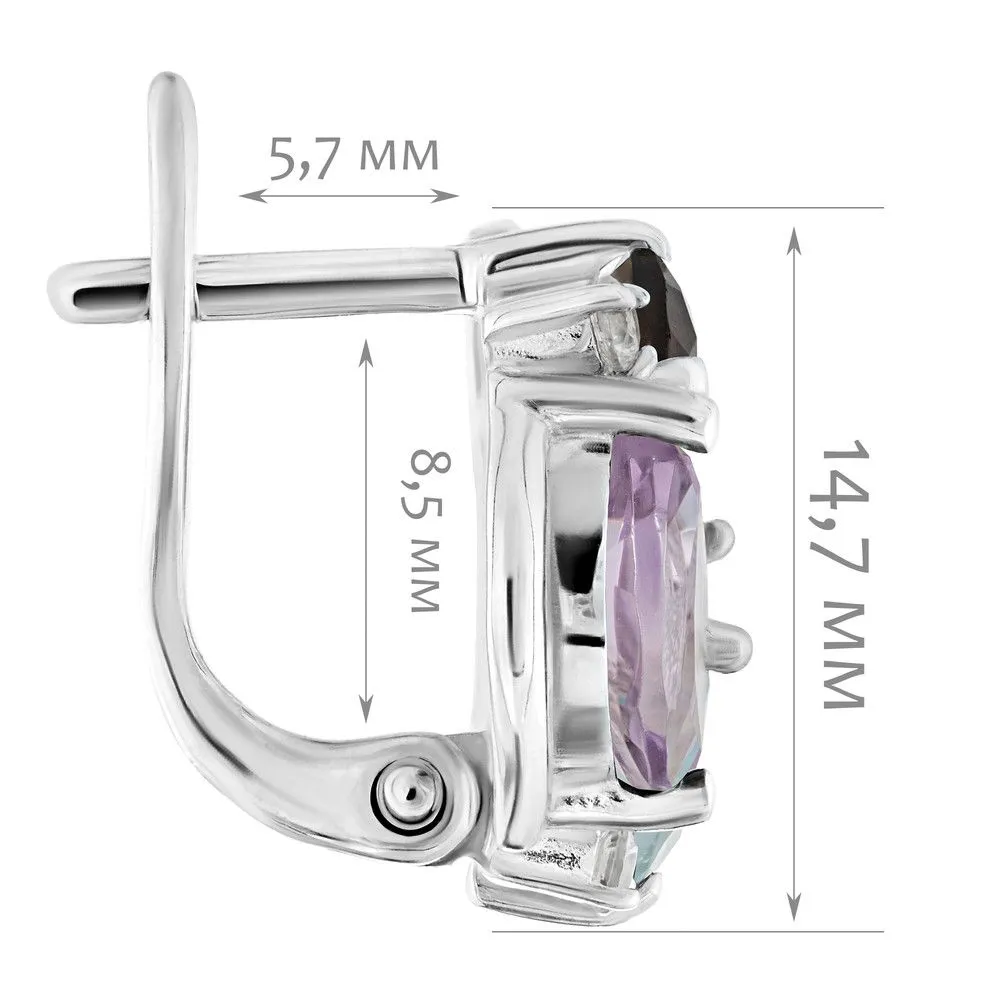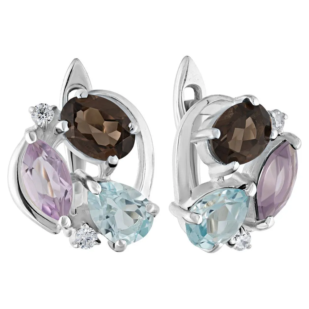 Серебряные серьги Фортуна с натуральными камнями раухтопаз, голубой топаз и аметист, покрытие Белый Родий. Средний вес украшения с камнями 5,64 гр. Месторождение(я) камней: Раухтопаз (Дымчатый кварц) (м-ние Додо ХМАО, Россия), Топаз (Ильменские горы, Россия), Аметист (Приполярный Урал, Россия). Аметист (Натуральный) маркиз: 4*8 мм., средний вес 0,50 карат. Раухтопаз (Натуральный) овал: 5*7 мм., средний вес 0,80 карат. Топаз (Натуральный) груша: 5*7 мм., средний вес 0,80 карат. Циркон белый (Натуральный) круг: 2 мм., средний вес 0,05 карат. Размер лицевой части: 13*14 мм. Все изделия собственного производства и имеют гарантию 12 месяцев. Арт. 6679WR . Аметист — прозрачный или полупрозрачный камень фиолетовых оттенков, подвид кварца. Он гармонизирует разум, снимает стресс, улучшает кровообращение, способствует умственному развитию и личностному росту. Считается, что он также оберегает от головной боли и бессонницы, служит противоядием, помогает избавиться от алкоголизма и наделяет владельца проницательностью, раскрывая «третий глаз» (за который отвечает чакра аджна). В медитации помогает расслабиться и успокоиться. Положенный под подушку, аметист приносит хорошие сны.