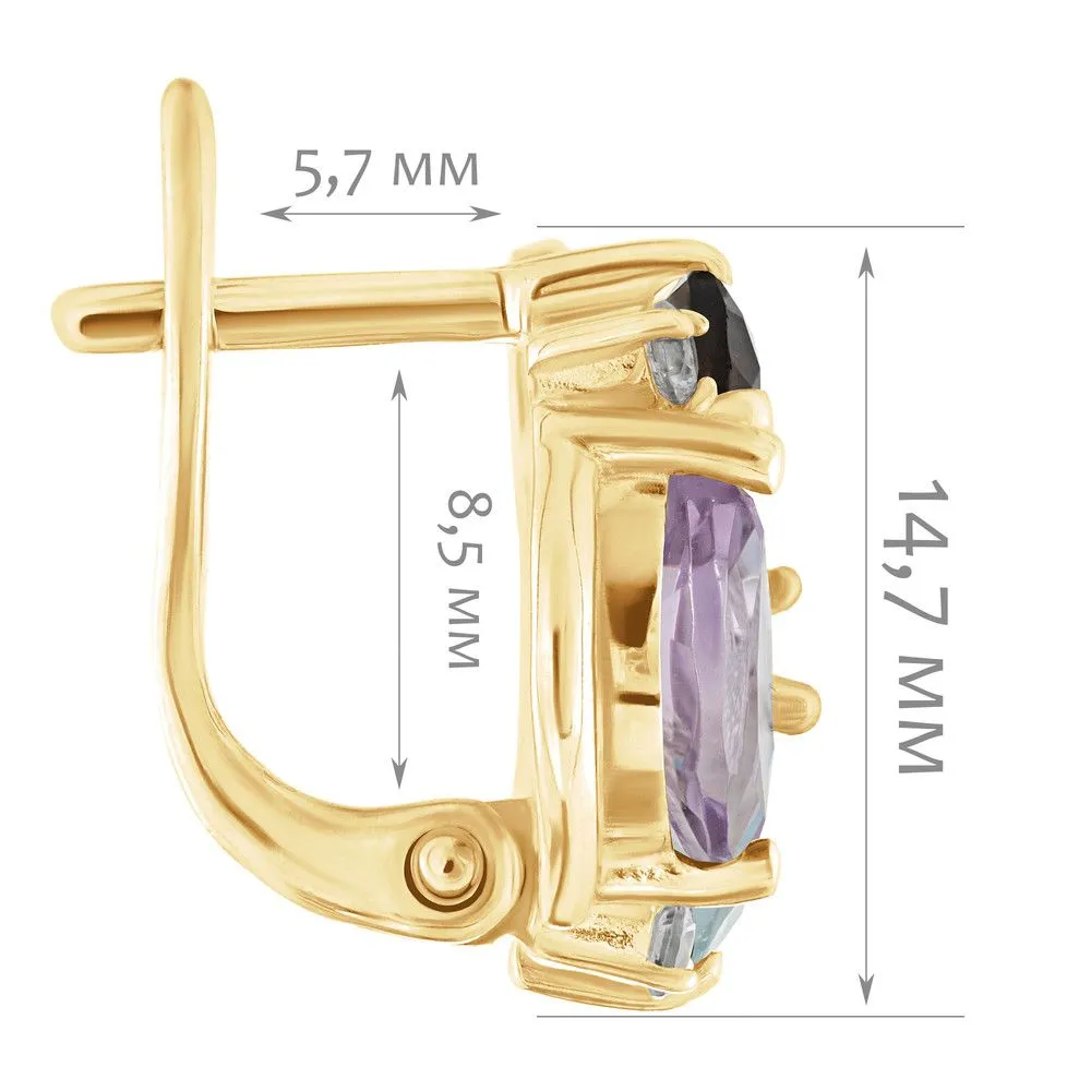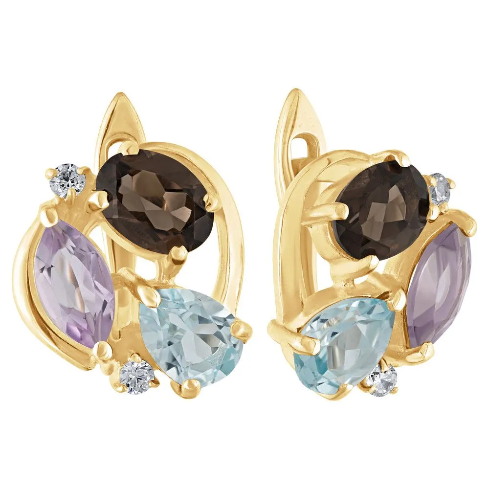 Серебряные серьги Фортуна с натуральными камнями раухтопаз, голубой топаз и аметист, покрытие Желтое Золото. Средний вес украшения с камнями 5,64 гр. Месторождение(я) камней: Раухтопаз (Дымчатый кварц) (м-ние Додо ХМАО, Россия), Топаз (Ильменские горы, Россия), Аметист (Приполярный Урал, Россия). Аметист (Натуральный) маркиз: 4*8 мм., средний вес 0,50 карат. Раухтопаз (Натуральный) овал: 5*7 мм., средний вес 0,80 карат. Топаз (Натуральный) груша: 5*7 мм., средний вес 0,80 карат. Циркон белый (Натуральный) круг: 2 мм., средний вес 0,05 карат. Размер лицевой части: 13*14 мм. Все изделия собственного производства и имеют гарантию 12 месяцев. Арт. 6679YG . Аметист — прозрачный или полупрозрачный камень фиолетовых оттенков, подвид кварца. Он гармонизирует разум, снимает стресс, улучшает кровообращение, способствует умственному развитию и личностному росту. Считается, что он также оберегает от головной боли и бессонницы, служит противоядием, помогает избавиться от алкоголизма и наделяет владельца проницательностью, раскрывая «третий глаз» (за который отвечает чакра аджна). В медитации помогает расслабиться и успокоиться. Положенный под подушку, аметист приносит хорошие сны.