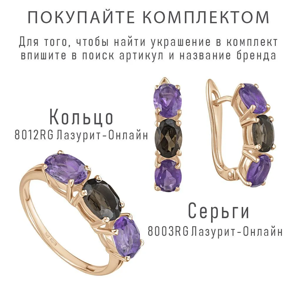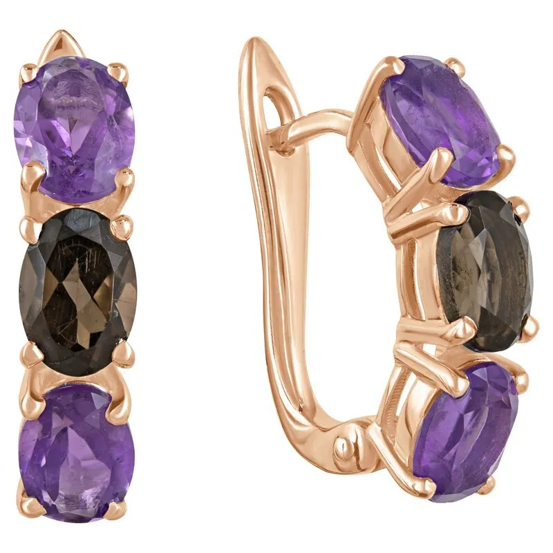 Серебряные серьги с натуральными камнями аметист и раухтопаз - коллекция Муза. Серебряные серьги 925 пробы с покрытием красное золото. Цвет покрытия соответствует швейцарскому цветовому стандарту NIHS -5N и цвету красного золота 585 в России. На последней фотографии мы разместили сравнительную фотографию 3 цвета золотого покрытия. Помимо предания золотого цвета Вашему изделию, тонкий слой золота защищает от окисления. Для более стойкого эффекта золочения и долговечности покрытия мы дополнительно наносим подслой палладия (Pd). Средний вес изделия с камнями 4.86гр. Месторождение(я): Аметист (Приполярный Урал, Россия) и Раухтопаз (Ильменские горы, Россия). Аметист (Натуральный) овал 5*7 мм., средний вес: 0.81 карат. Раухтопаз (Натуральный) овал 5*7 мм., средний вес: 0.75 карат. Все изделия собственного производства. Гарантия 12 месяцев.Арт. 8003.