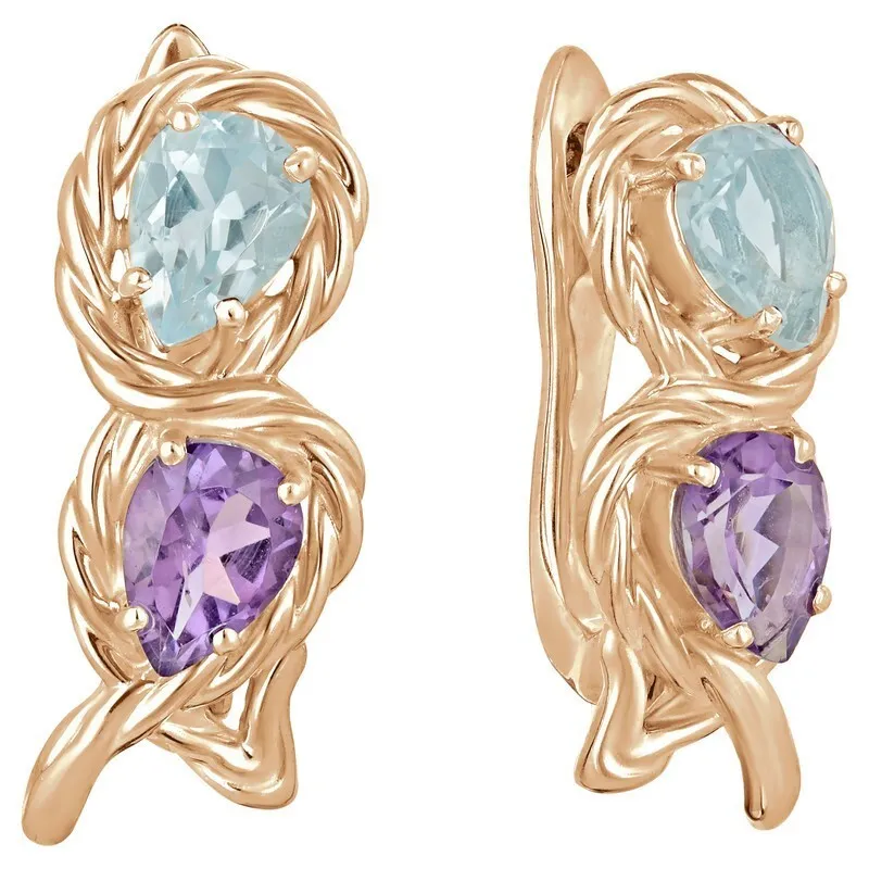 Серебряные серьги с натуральным аметист и топазом - коллекция Ривьера. Серебряные серьги 925 пробы с покрытием розовое золото. Цвет покрытия соответствует швейцарскому цветовому стандарту NIHS -4N и цвету розового золота 585 в России. На последней фотографии мы разместили сравнительную фотографию 3 цвета золотого покрытия. Помимо предания золотого цвета Вашему изделию, тонкий слой золота защищает от окисления. Для более стойкого эффекта золочения и долговечности покрытия мы дополнительно наносим подслой палладия (Pd). Средний вес изделия с камнями 5.53 гр. Месторождение(я): Аметист (Приполярный Урал, Россия) и Топаз (Ильменские горы, Россия). Аметист (Натуральный) груша 5*7 мм., средний вес: 0.68 карат. Топаз (Натуральный) груша 5*7 мм., средний вес: 0.85 карат. Размер лицевой части: 9*24 мм. Все изделия собственного производства. Гарантия 12 месяцев.Арт. 7878. Аметист — прозрачный или полупрозрачный камень фиолетовых оттенков, подвид кварца. Он гармонизирует разум, снимает стресс, улучшает кровообращение, способствует умственному развитию и личностному росту. Считается, что он также оберегает от головной боли и бессонницы, служит противоядием, помогает избавиться от алкоголизма и наделяет владельца проницательностью, раскрывая «третий глаз» (за который отвечает чакра аджна). В медитации помогает расслабиться и успокоиться. Положенный под подушку, аметист приносит хорошие сны.