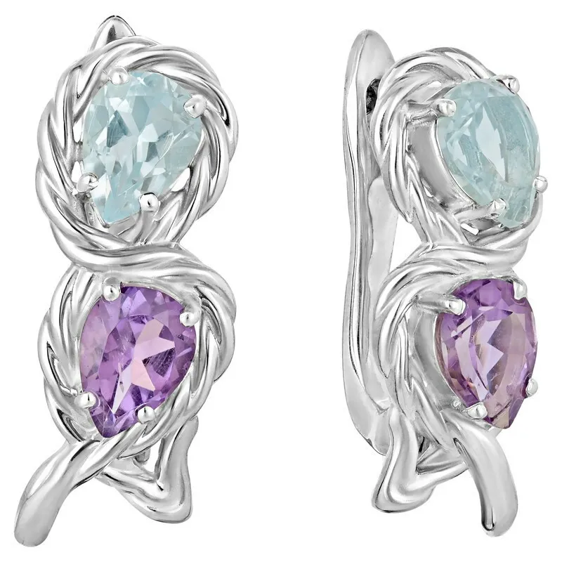 Серебряные серьги с натуральным аметист и топазом - коллекция Ривьера. Средний вес изделия с камнями 5.53 гр. Месторождение(я): Аметист (Приполярный Урал, Россия) и Топаз (Ильменские горы, Россия). Аметист (Натуральный) груша 5*7 мм., средний вес: 0.68 карат. Топаз (Натуральный) груша 5*7 мм., средний вес: 0.85 карат. Размер лицевой части: 9*24 мм. Все изделия собственного производства. Гарантия 12 месяцев.Арт. 7878. Аметист — прозрачный или полупрозрачный камень фиолетовых оттенков, подвид кварца. Он гармонизирует разум, снимает стресс, улучшает кровообращение, способствует умственному развитию и личностному росту. Считается, что он также оберегает от головной боли и бессонницы, служит противоядием, помогает избавиться от алкоголизма и наделяет владельца проницательностью, раскрывая «третий глаз» (за который отвечает чакра аджна). В медитации помогает расслабиться и успокоиться. Положенный под подушку, аметист приносит хорошие сны.
