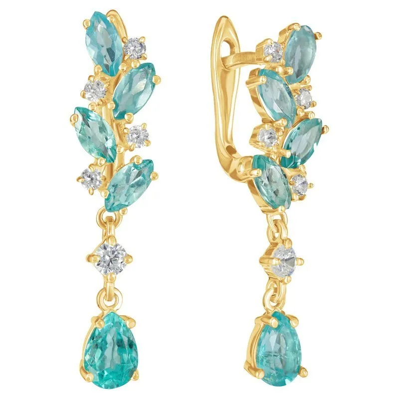 Серебряные серьги с натуральным апатитом - коллекция Росинка. Серебряные серьги 925 пробы с покрытием желтое золото. Цвет покрытия соответствует швейцарскому цветовому стандарту NIHS -FF24ct и цвету чистого золото 999.99. На последней фотографии мы разместили сравнительную фотографию 3 цвета золотого покрытия. Помимо предания золотого цвета Вашему изделию, тонкий слой золота защищает от окисления. Для более стойкого эффекта золочения и долговечности покрытия мы дополнительно наносим подслой палладия (Pd). Средний вес изделия с камнями 4.5 гр. Месторождение: Апатит (Мадагаскар). Апатит (Натуральный) груша 5*7 мм., средний вес: 0.64 карат. Все изделия собственного производства. Гарантия 12 месяцев.Арт. 8420. Апатит — минерал, напоминающий при огранке топаз. Имеет фосфатную природу. Сам по себе бесцветен, но примеси придают ему множество оттенков. Считается, что он приносит владельцу успокоение, умиротворение, то есть стабилизирует нервную систему и благотворно влияет на психическое и эмоциональное состояния.