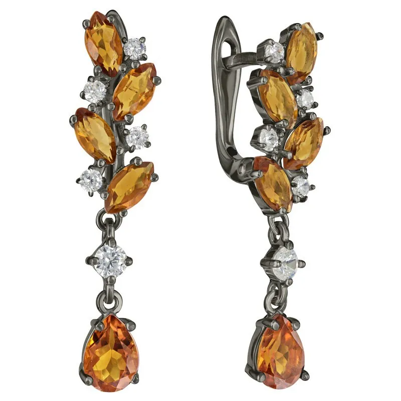 Серебряные серьги с натуральным цитрином (мадейра) - коллекция Росинка, покрытие Черный Родий.
