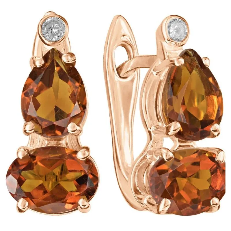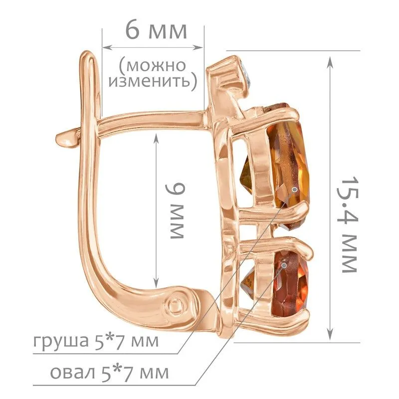 Серебряные серьги с натуральным цитрином (мадейра) - коллекция Сансара / покрытие Красное Золото.Средний вес украшения с камнями 3.26 гр.Месторождение(я): Цитрин (Урал, Россия).Ювелирные вставки:Цитрин (Натуральный) овал 5*7 мм., средний вес: 0.73 карат.Цитрин (Натуральный) груша 5*7 мм., средний вес: 0.61 карат.Белый Нанокристалл круг 2 мм., средний вес: 0.06 карат.Все изделия собственного производства и имеют гарантию 12 месяцев. Арт. 8693RG . Цитрин – камень, который активно использовался для инкрустации. С его помощью излечивали заболевания желудочно-кишечного тракта, он становился амулетом, приносящим удачу. Золотисто-жёлтый камень известен и любим очень давно за ряд своих положительных качеств.