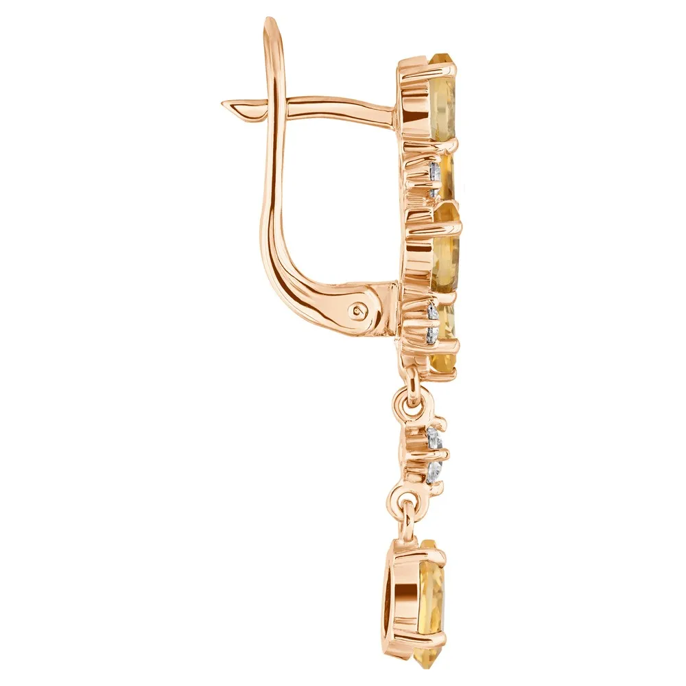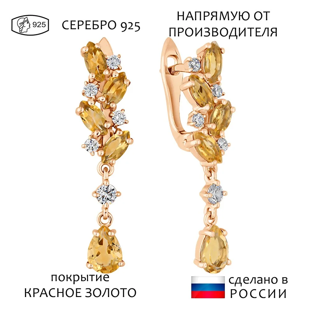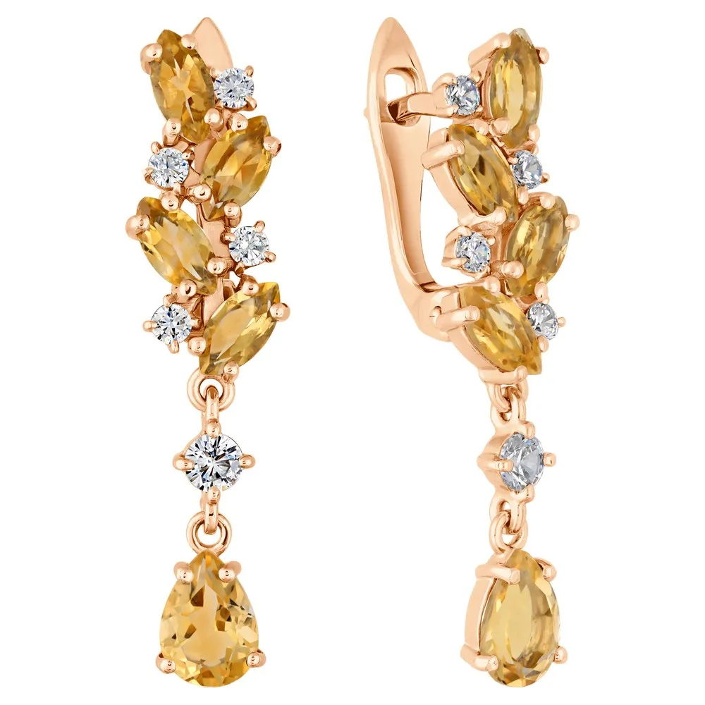 Серебряные серьги с натуральным цитрином - коллекция Росинка / Красное золото.