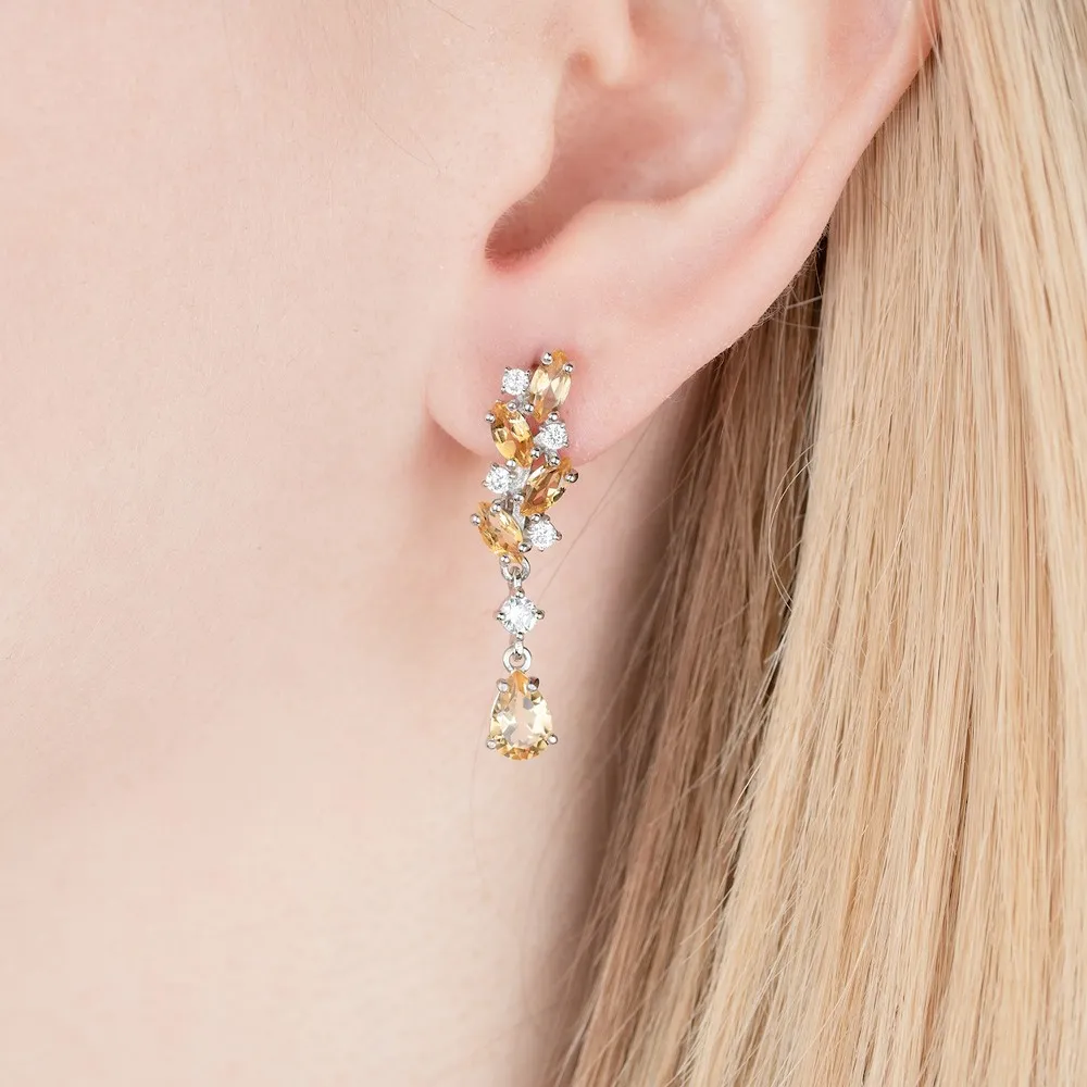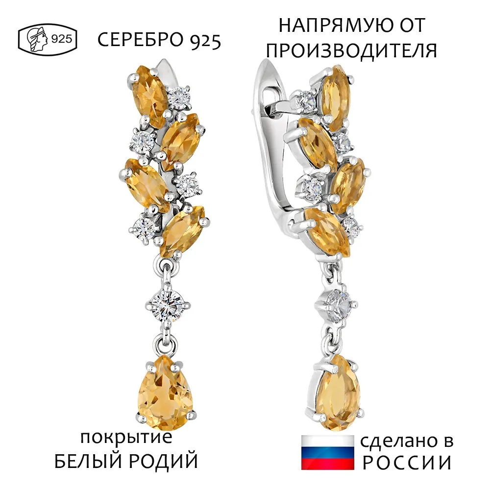 Серебряные серьги с натуральным цитрином - коллекция Росинка / Белый Родий.
