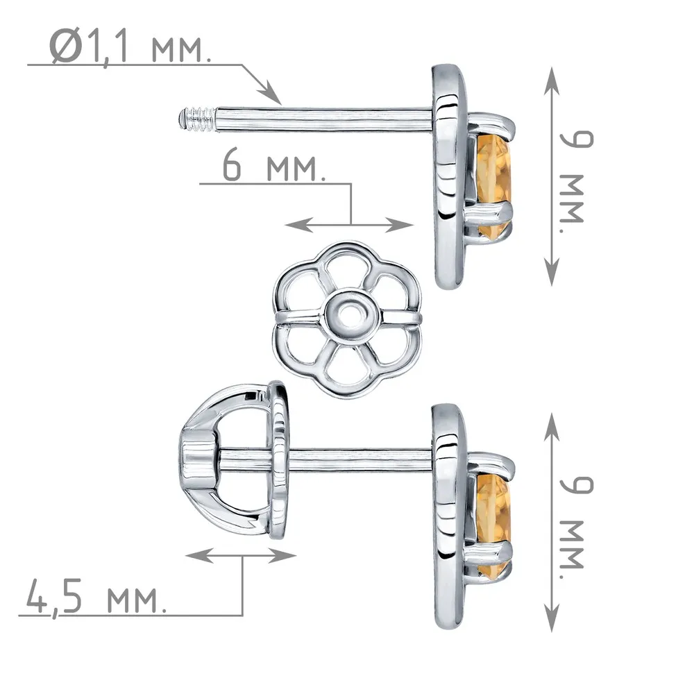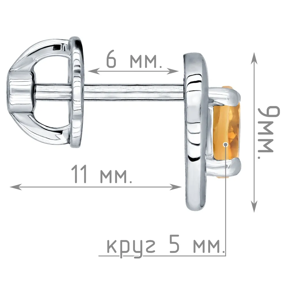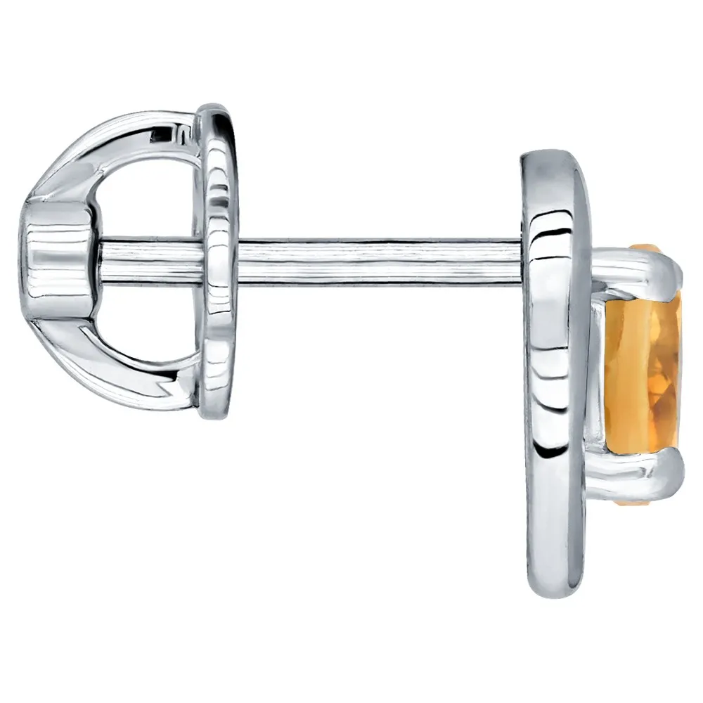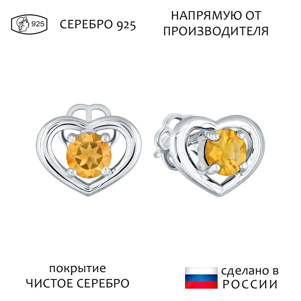 Серебряные серьги гвоздики (пусеты) с натуральным цитрином - Сердце / покрытие Чистое Серебро.