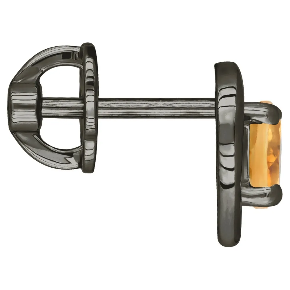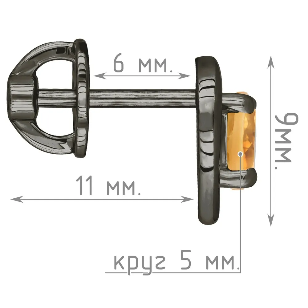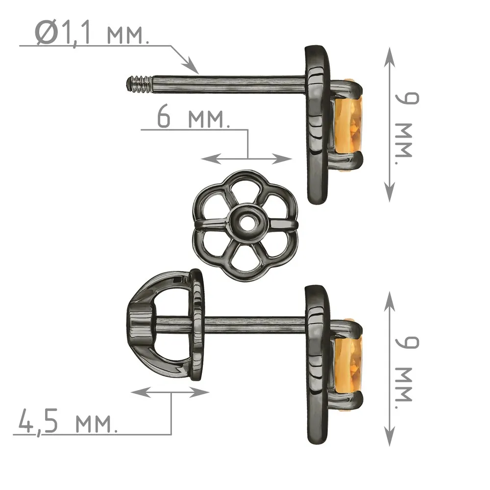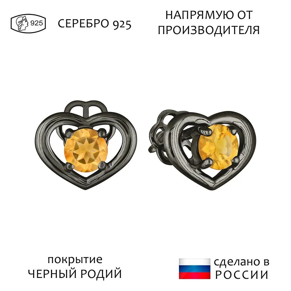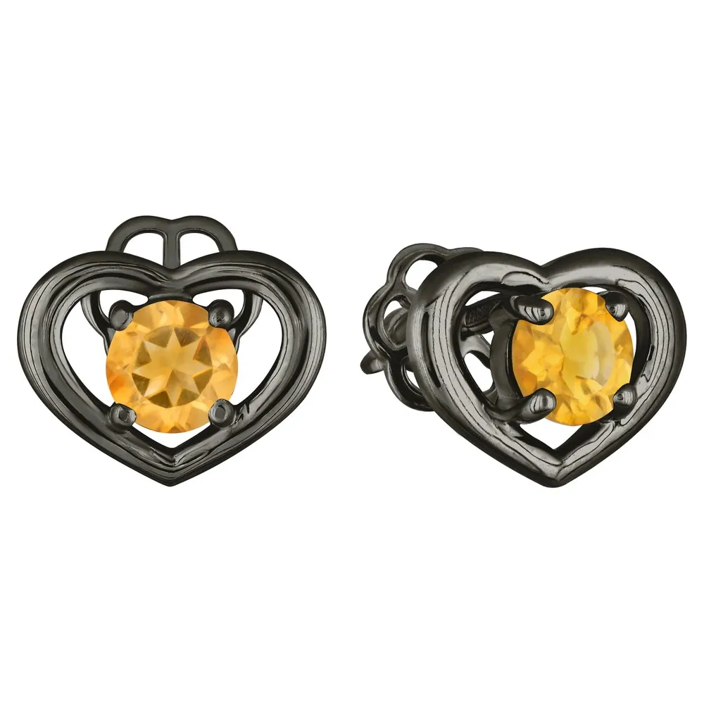 Серебряные серьги гвоздики (пусеты) с натуральным цитрином - Сердце / покрытие Черный Родий.