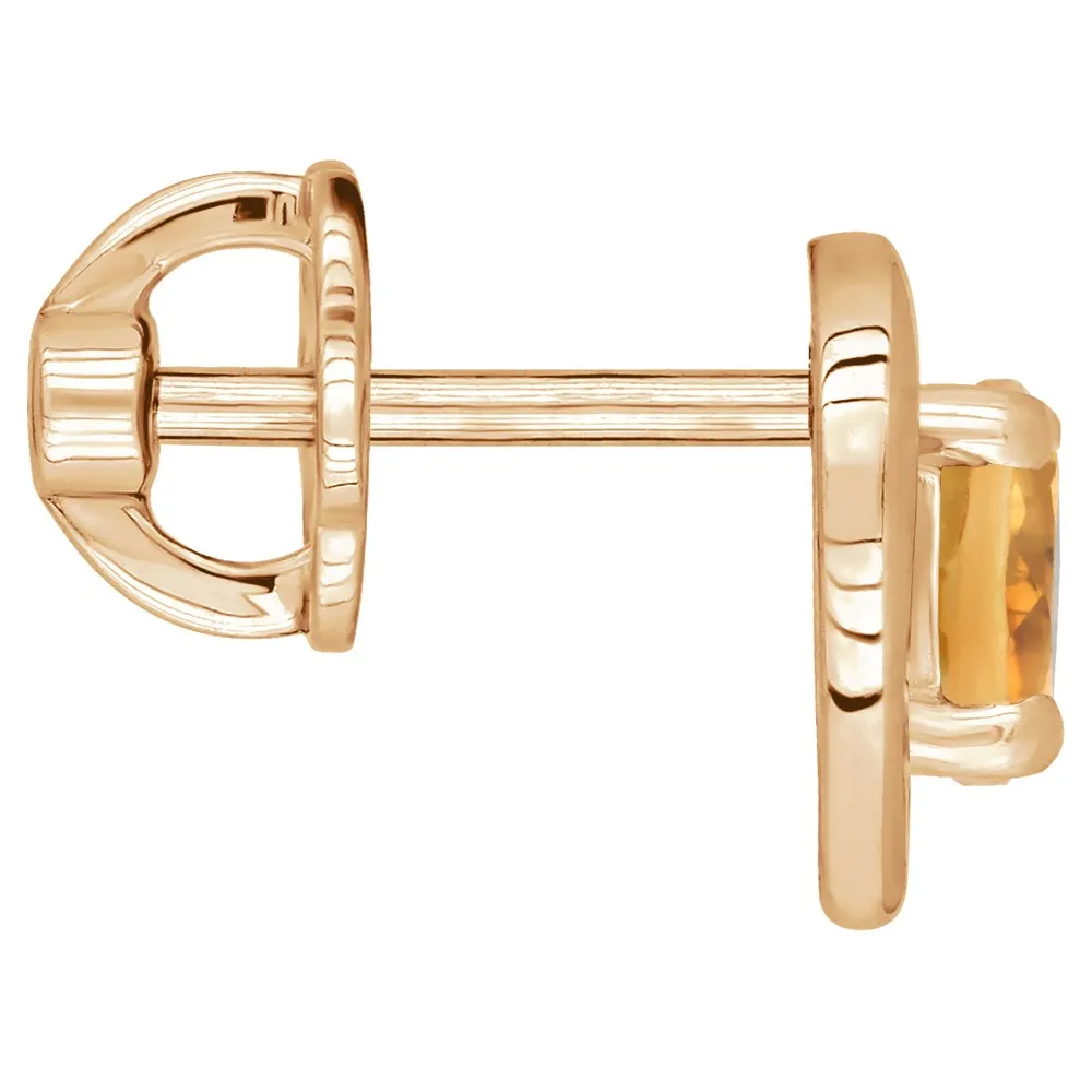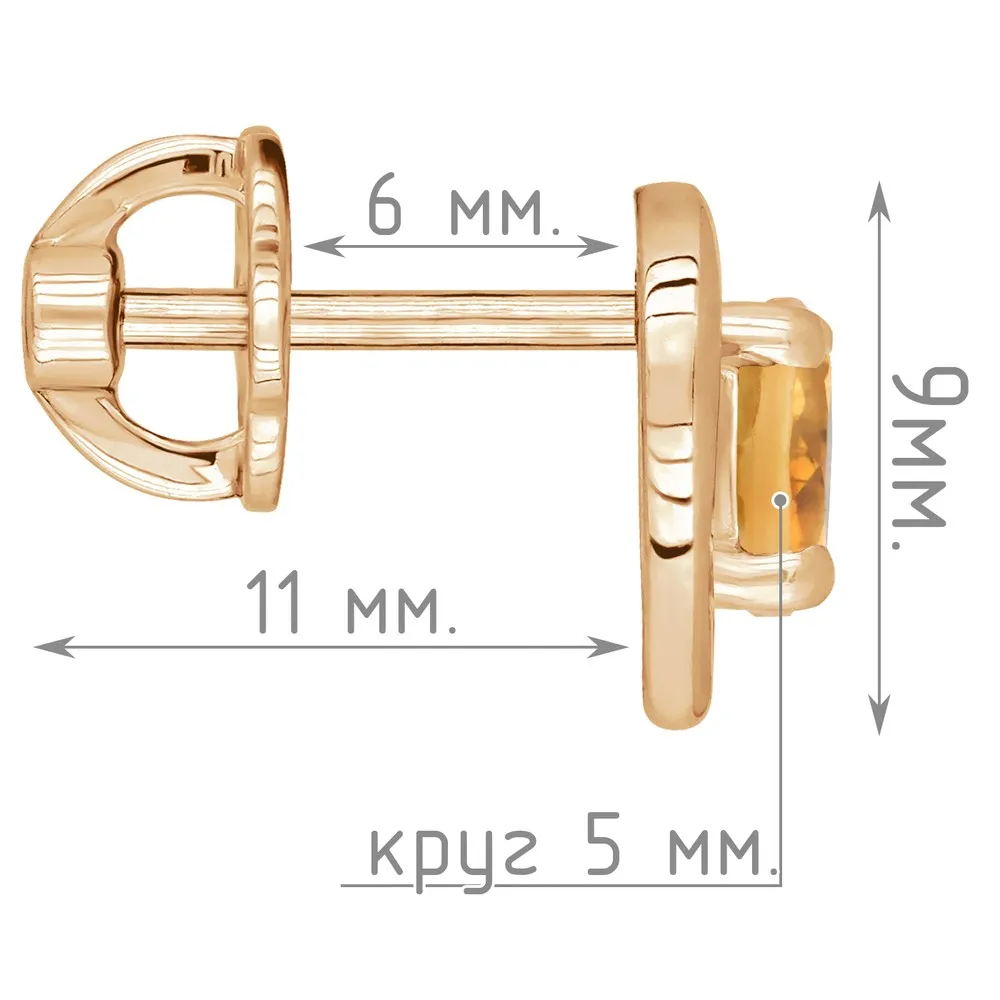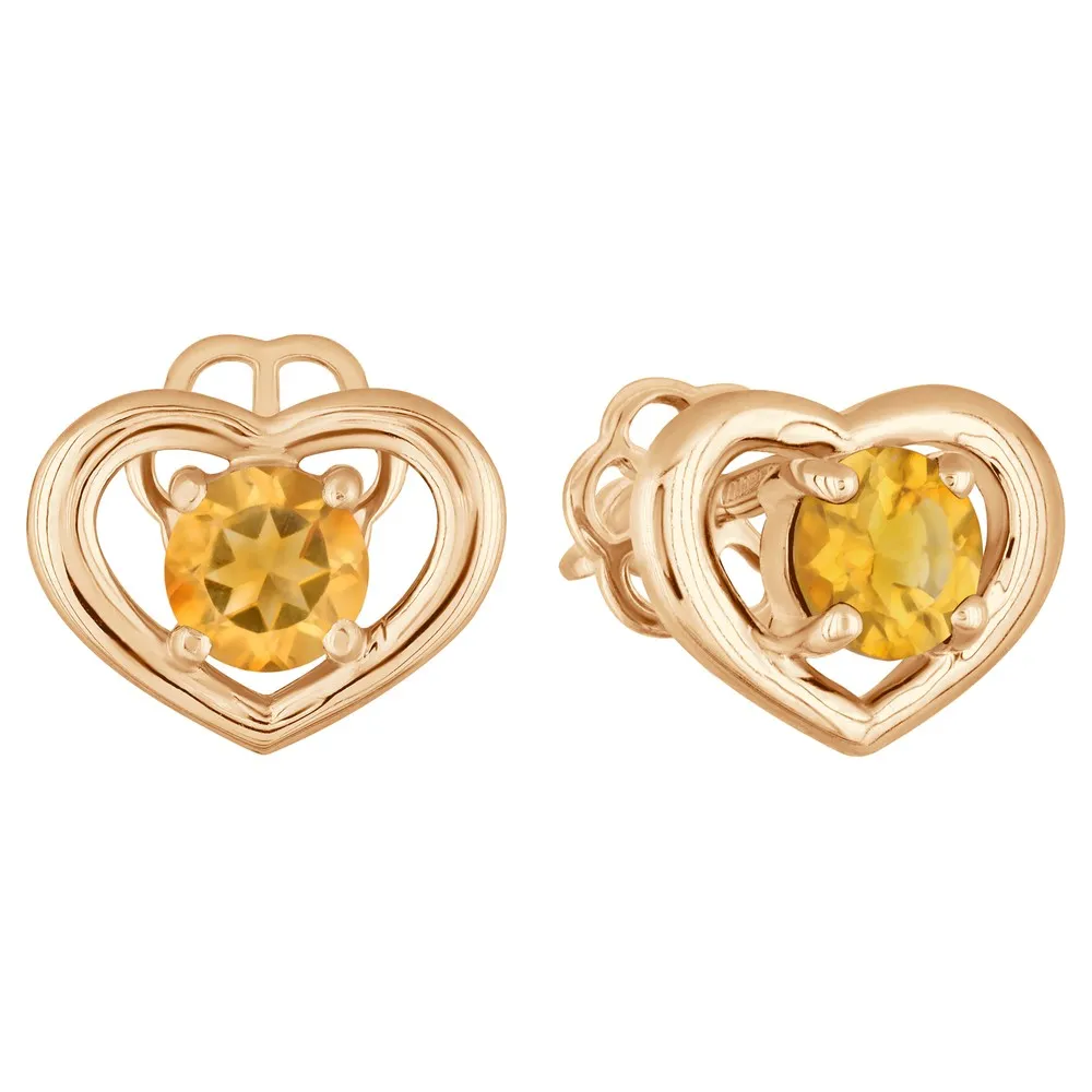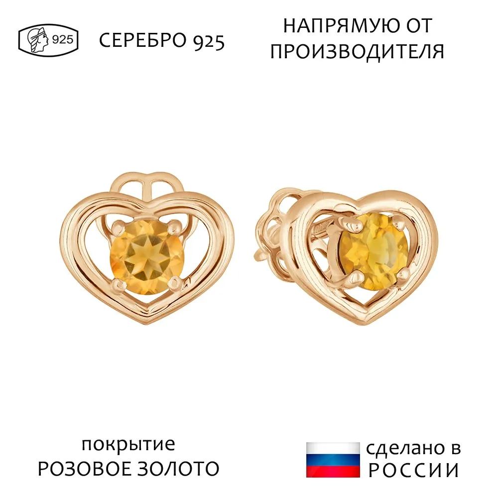 Серебряные серьги гвоздики (пусеты) с натуральным цитрином - Сердце / покрытие Розовое Золото.