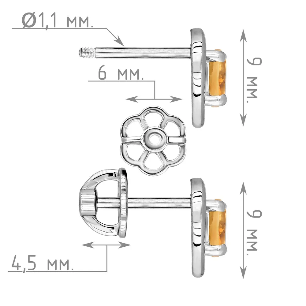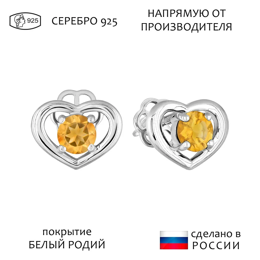 Серебряные серьги гвоздики (пусеты) с натуральным цитрином - Сердце / покрытие Белый Родий.