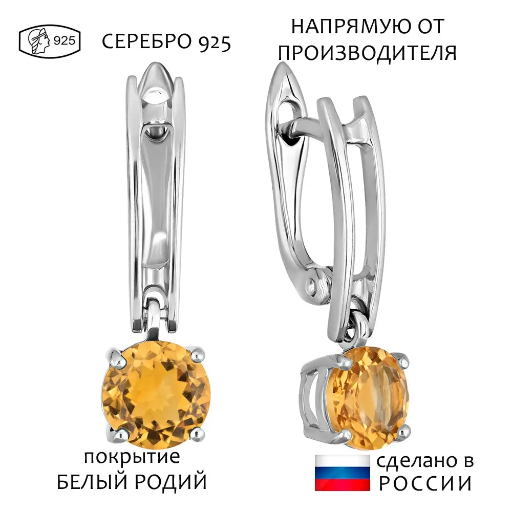 Серебряные серьги с натуральным цитрином - коллекция Классик (мини) / покрытие Белый Родий
