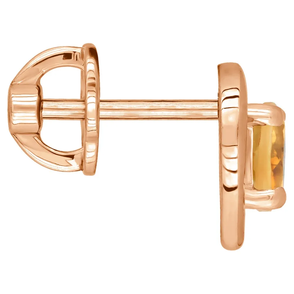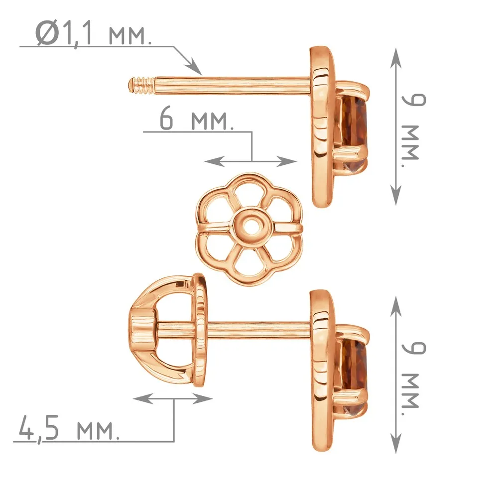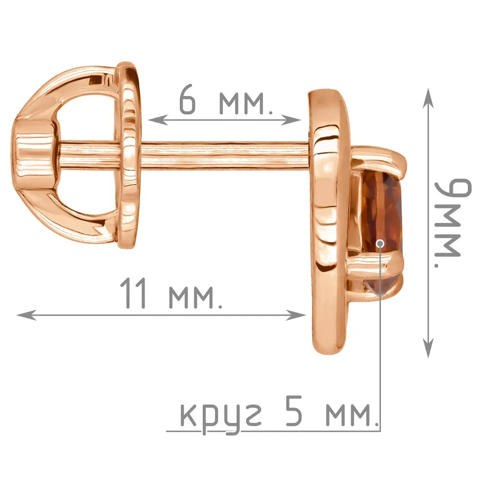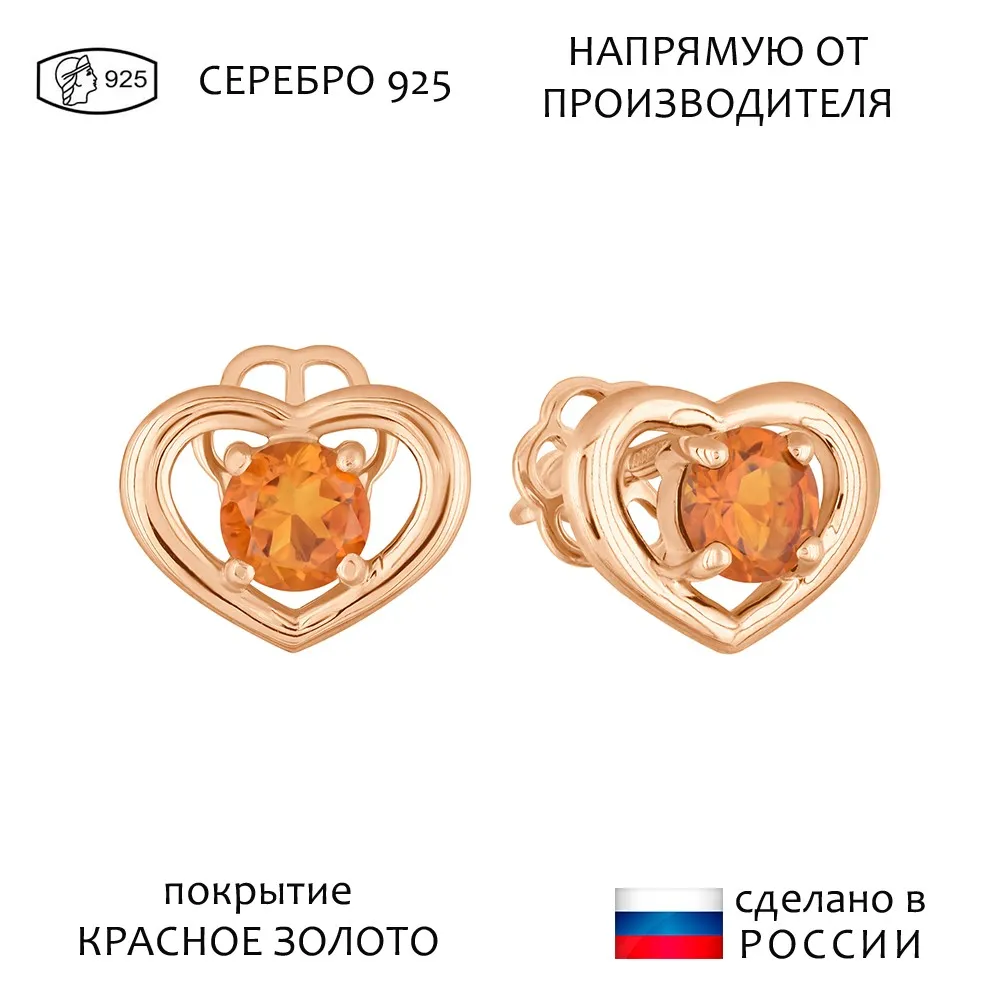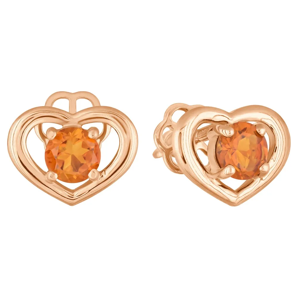 Серебряные серьги гвоздики (пусеты) с натуральным цитрином (мадейра) - Сердце / покрытие Красное золото.