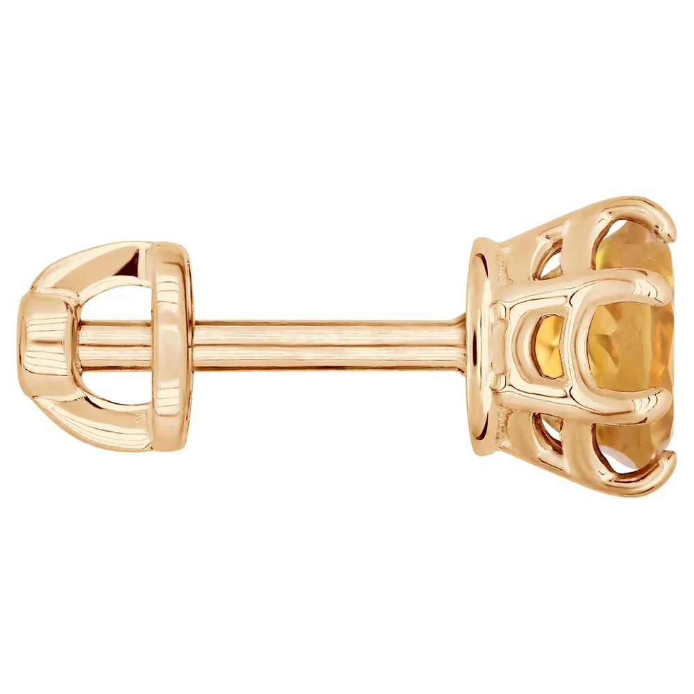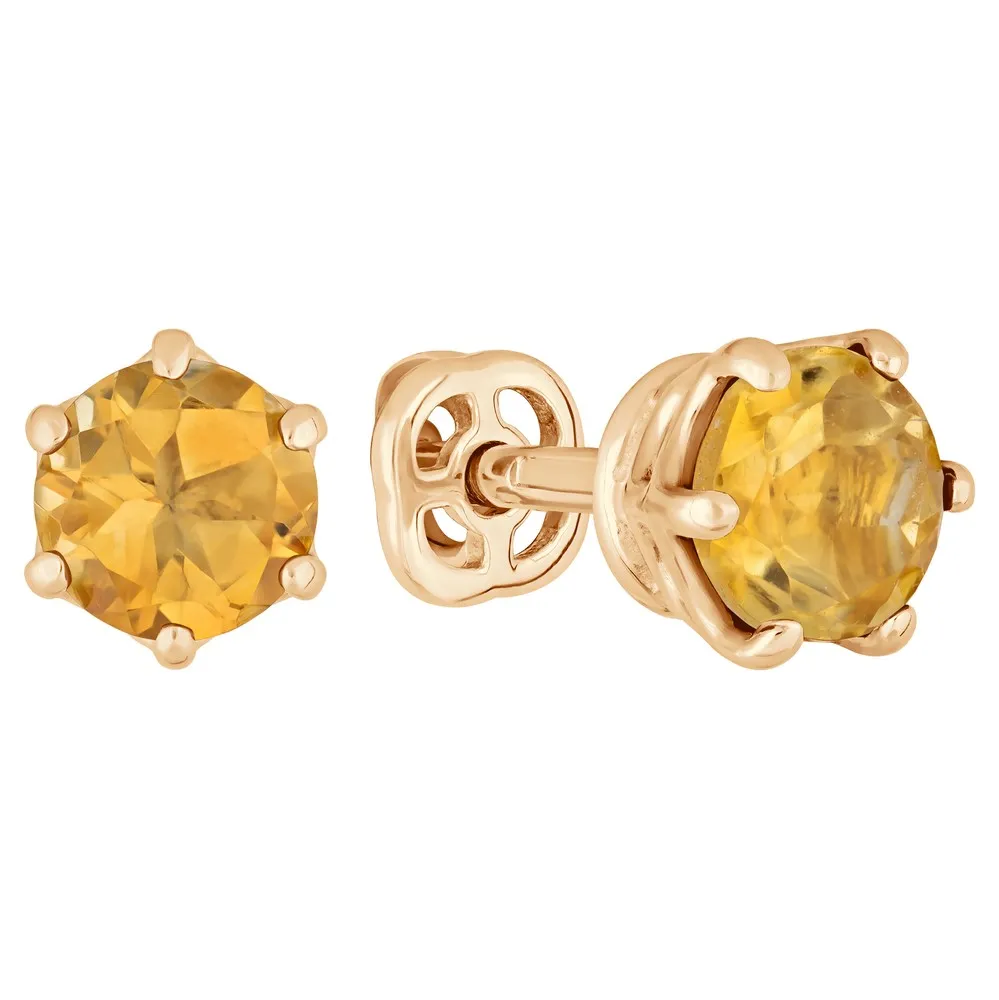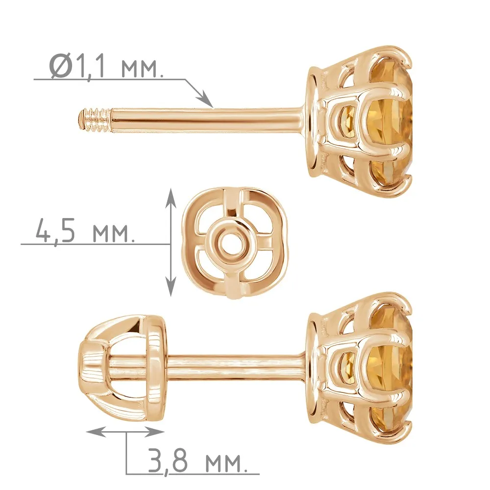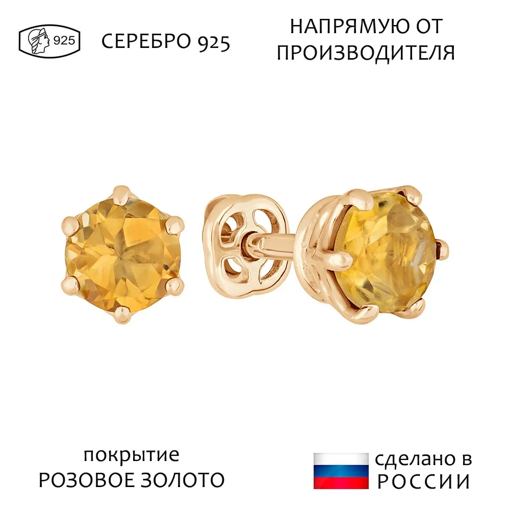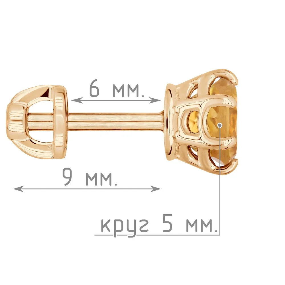 Серебряные серьги гвоздики (пусеты) с натуральным цитрином 5 мм. / Розовое Золото.