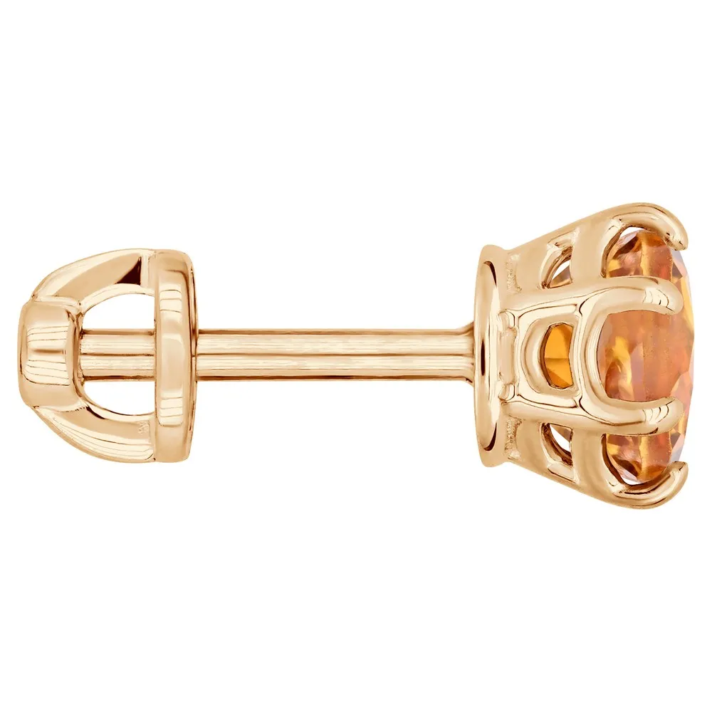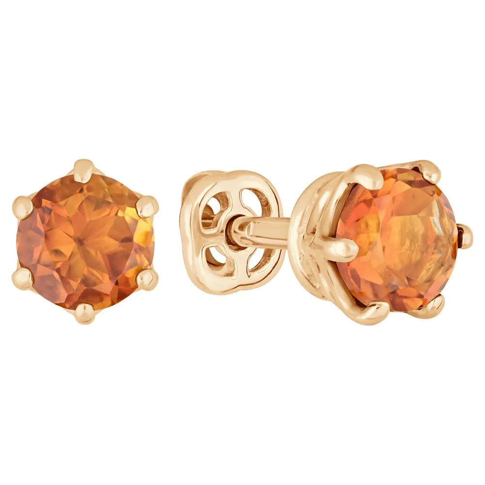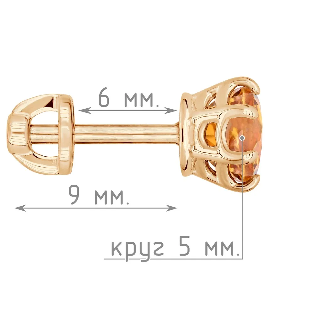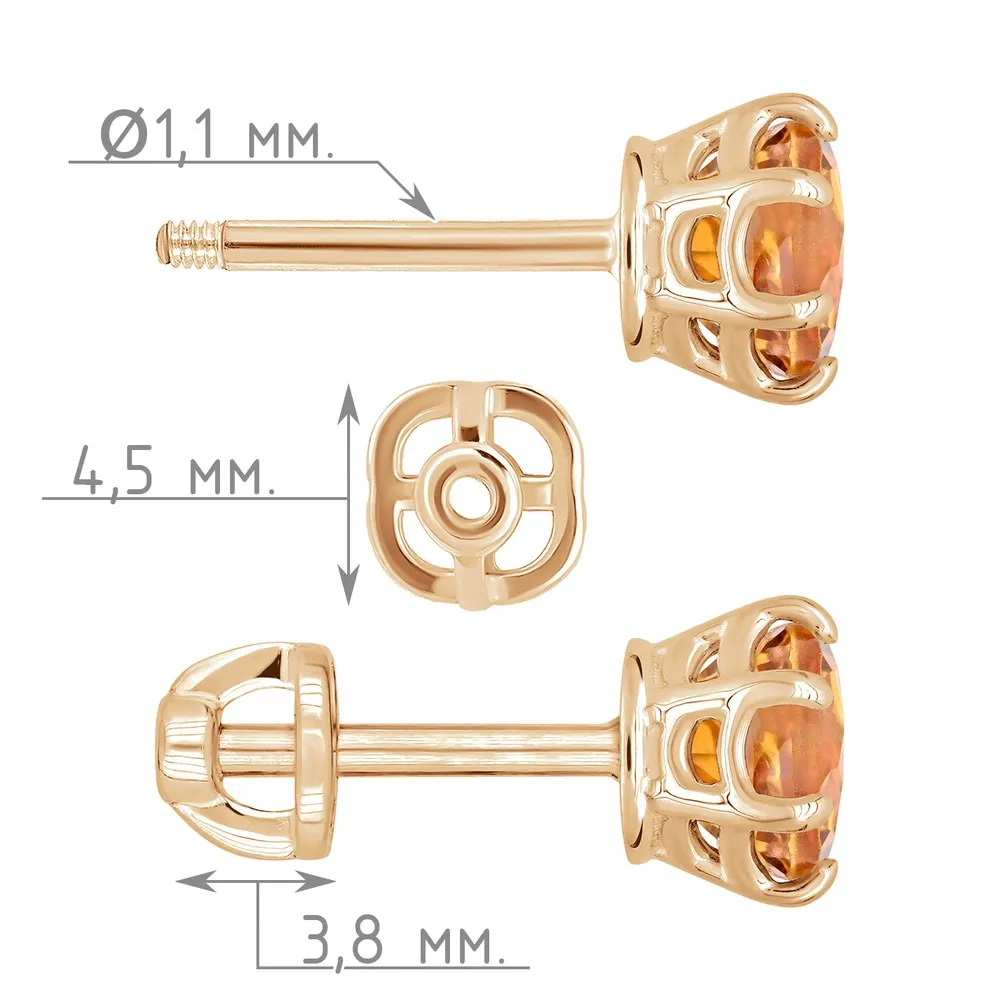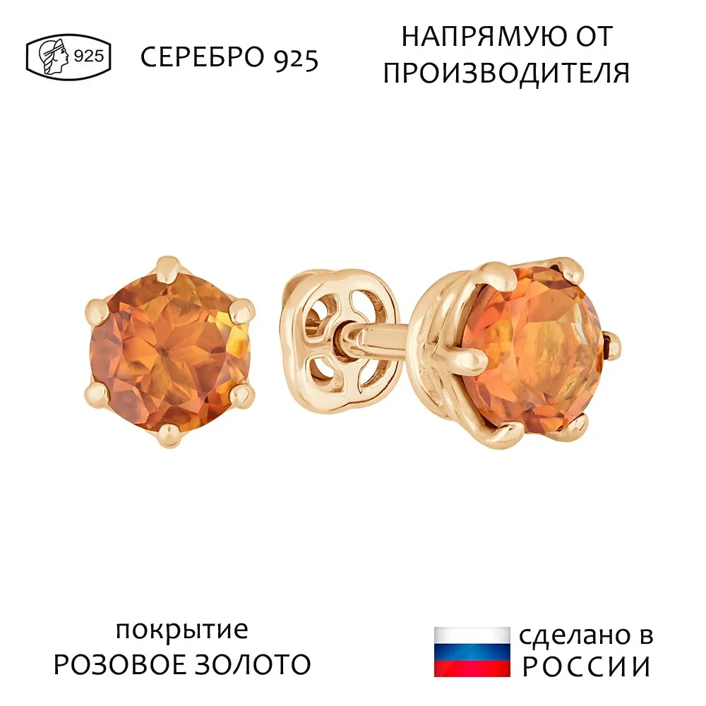 Серебряные серьги гвоздики (пусеты) с натуральным цитрином (мадейра) 5 мм. / Розовое Золото.