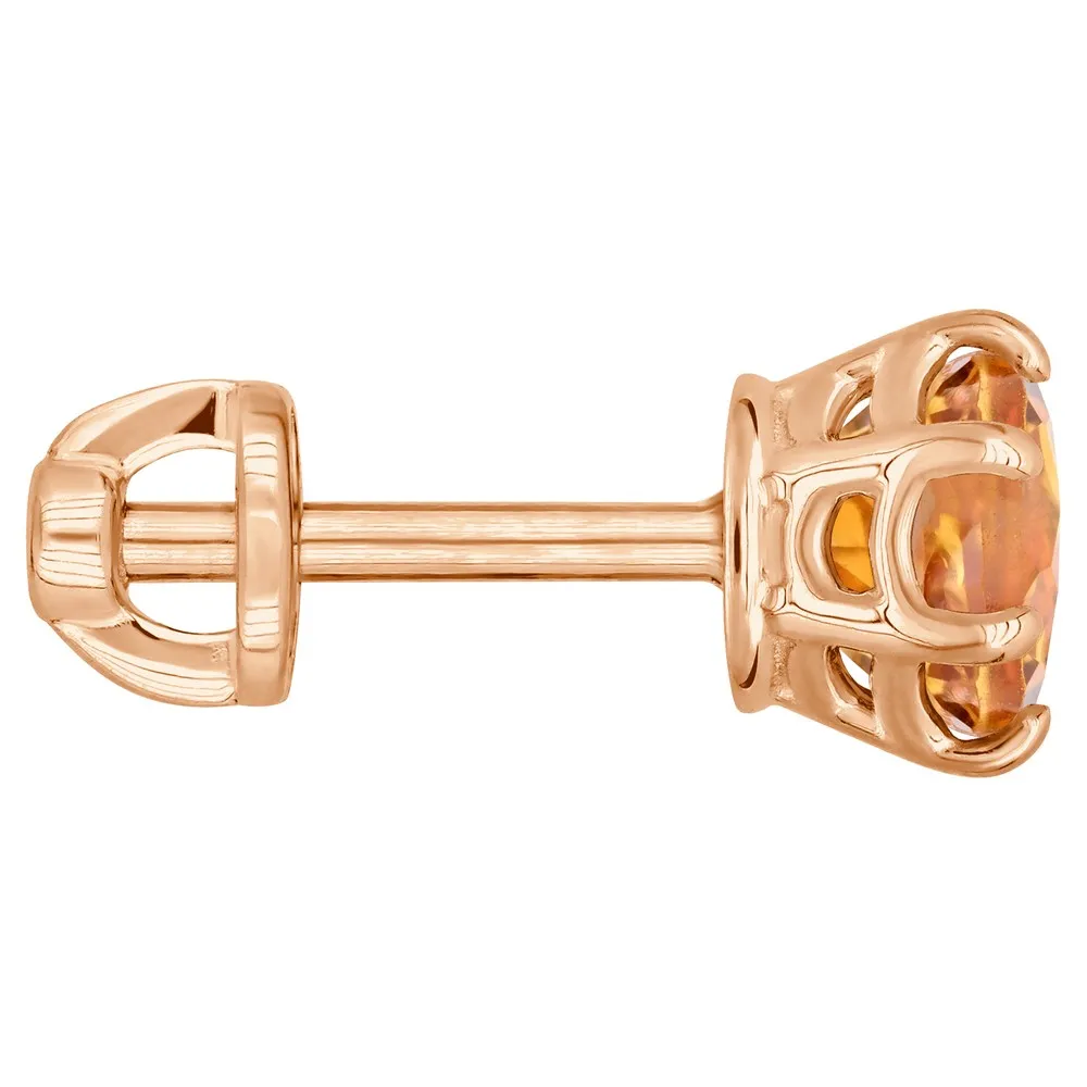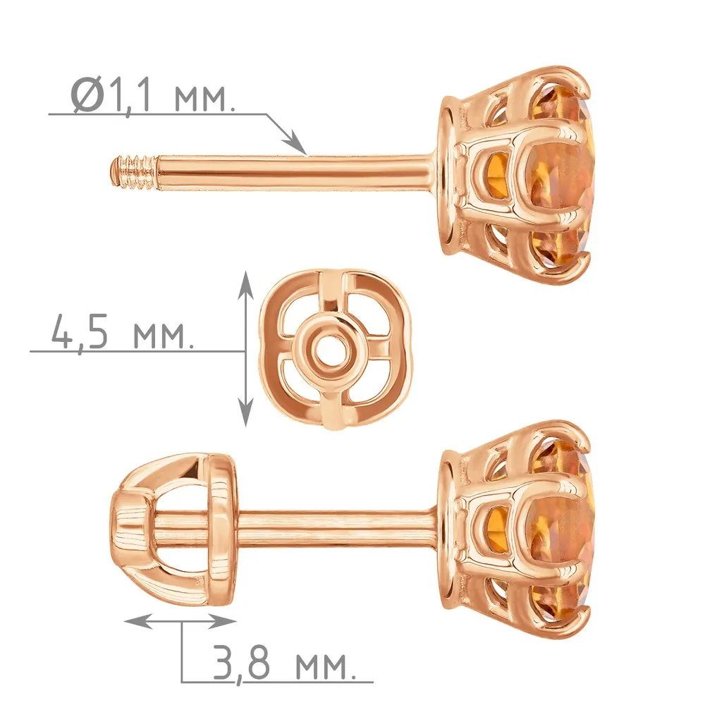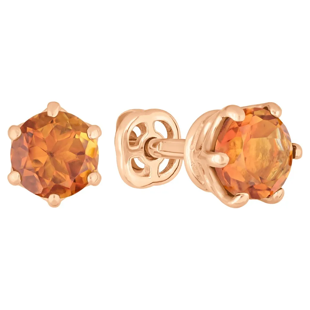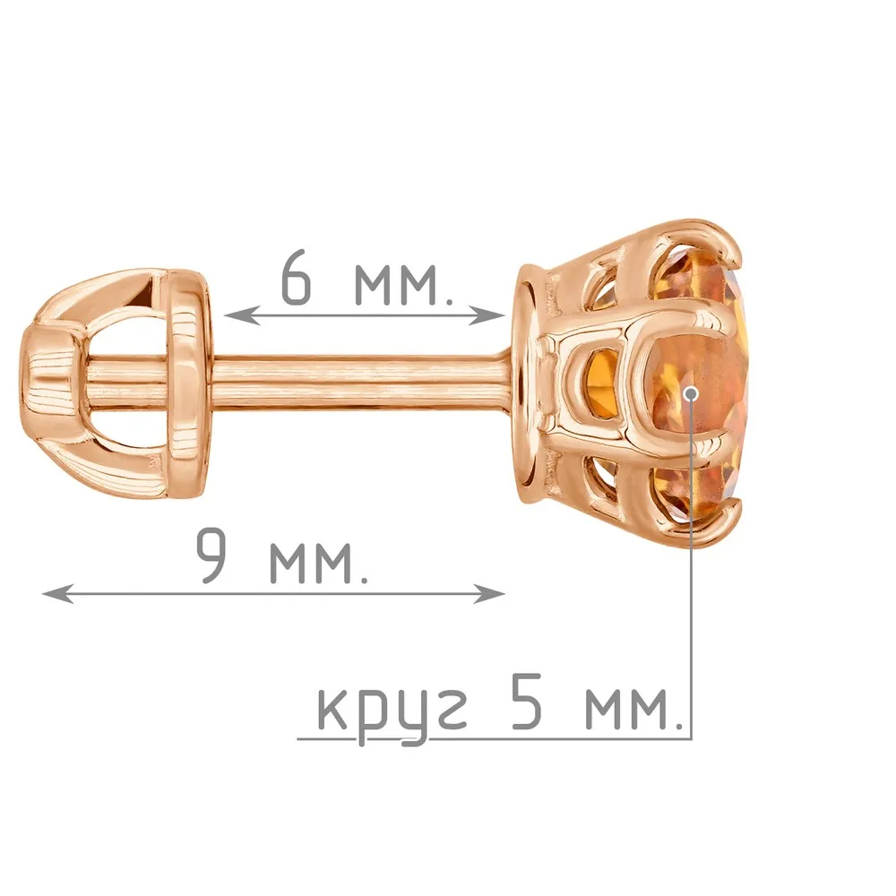 Серебряные серьги гвоздики (пусеты) с натуральным цитрином (мадейра) 5 мм. / Красное золото.