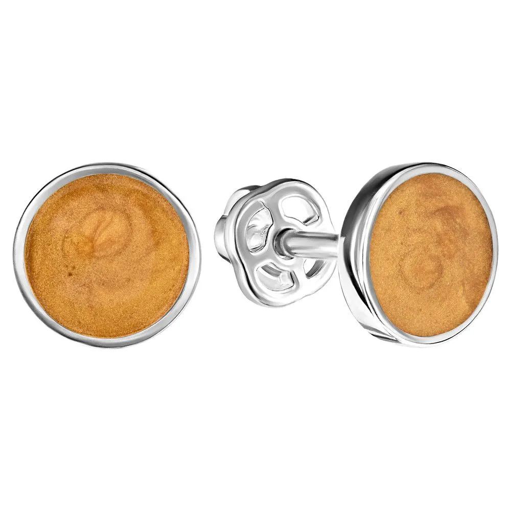 Серебряные серьги гвоздики (пусеты) с эмалью - цвет золотой перламутр / Без покрытия. Средний вес ювелирного украшения 1.27 гр. Эмаль – холодная двухкомпонентная итальянская эмаль высокого качества. Имеет высокую степень устойчивости к царапинам и солнечному свету, ударам и механическим повреждениям.< /p> Все изделия собственного производства и имеют гарантию 12 месяцев. Арт. 8587NP.