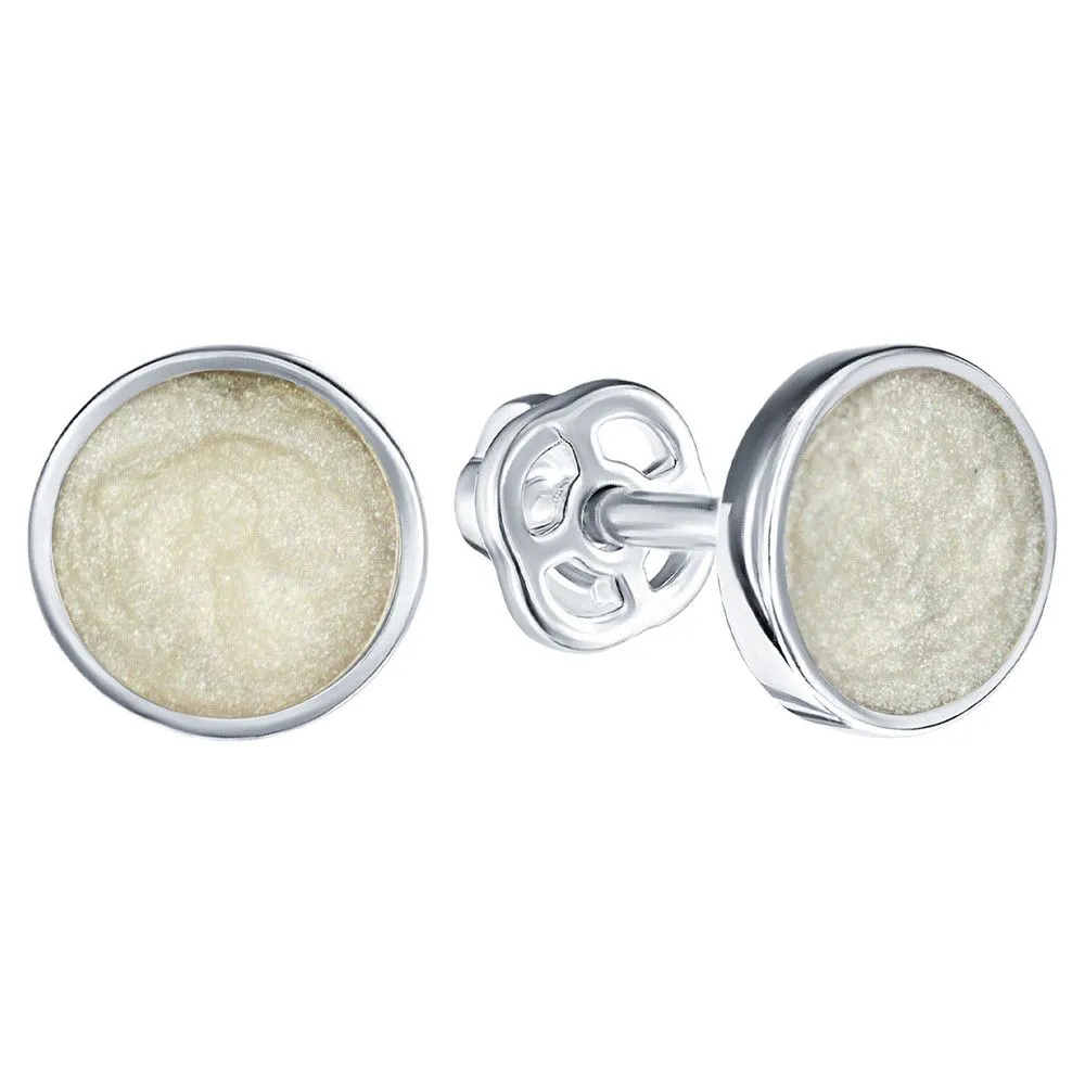 Серебряные серьги гвоздики (пусеты) с эмалью - цвет белый перламутр / Чистое Серебро. Средний вес ювелирного украшения 1.27 гр. Эмаль – холодная двухкомпонентная итальянская эмаль высокого качества. Имеет высокую степень устойчивости к царапинам и солнечному свету, ударам и механическим повреждениям.< /p> Все изделия собственного производства и имеют гарантию 12 месяцев. Арт. 8589AG.