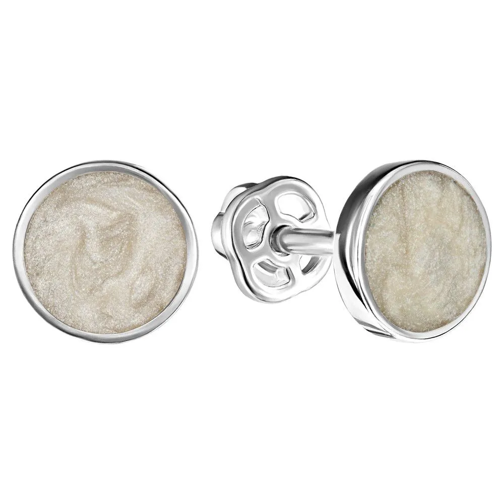 Серебряные серьги гвоздики (пусеты) с эмалью - цвет белый перламутр / Белый Родий. Средний вес ювелирного украшения 1.27 гр. Эмаль – холодная двухкомпонентная итальянская эмаль высокого качества. Имеет высокую степень устойчивости к царапинам и солнечному свету, ударам и механическим повреждениям.< /p> Все изделия собственного производства и имеют гарантию 12 месяцев. Арт. 8589WR.