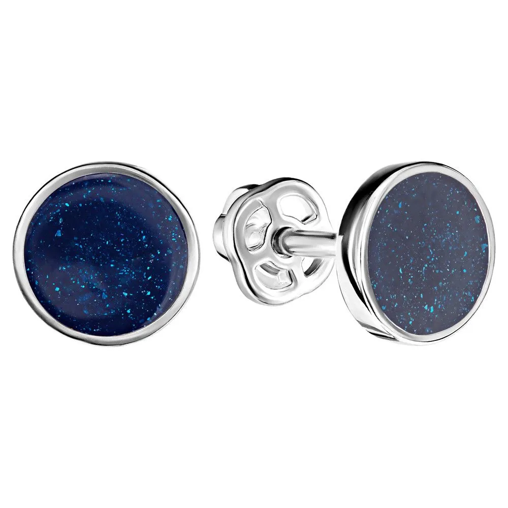 Серебряные серьги гвоздики (пусеты) с эмалью - цвет синий перламутр / Белый Родий. Средний вес ювелирного украшения 1.27 гр. Эмаль – холодная двухкомпонентная итальянская эмаль высокого качества. Имеет высокую степень устойчивости к царапинам и солнечному свету, ударам и механическим повреждениям.< /p> Все изделия собственного производства и имеют гарантию 12 месяцев. Арт. 8590WR.