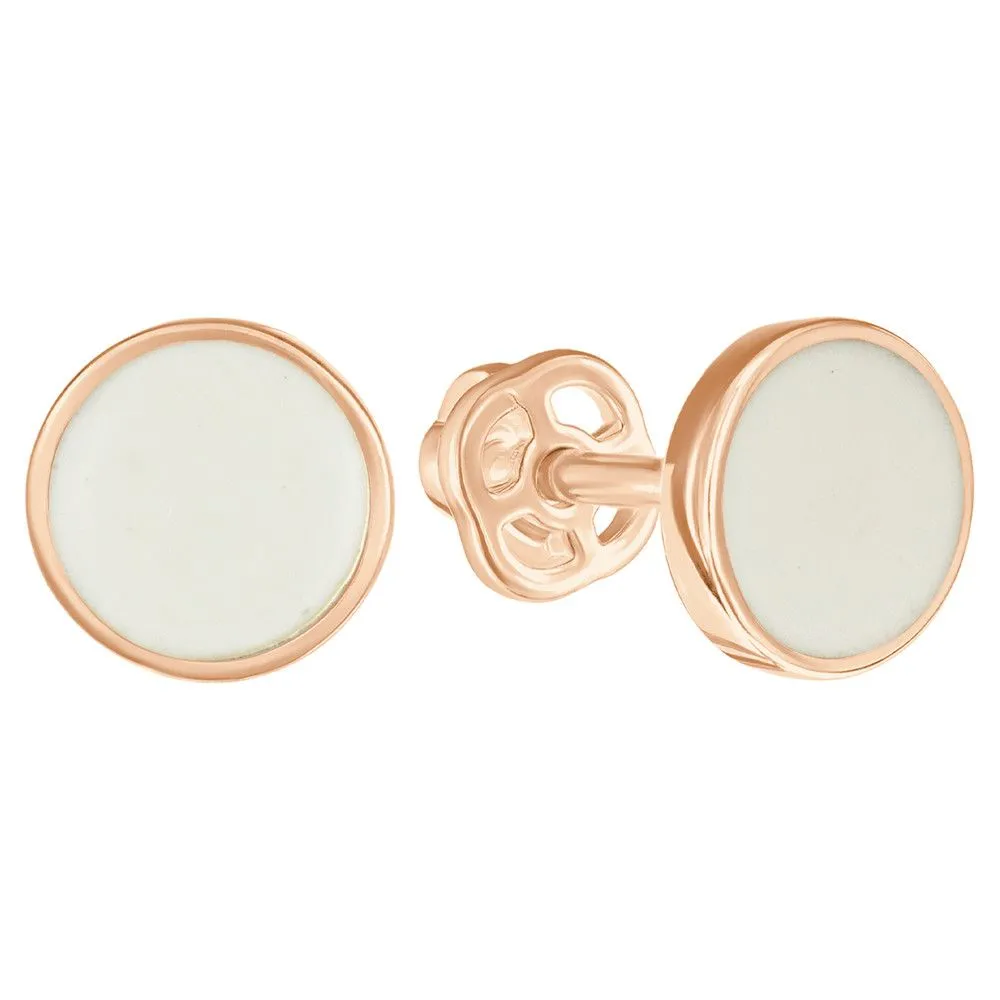 Серебряные серьги гвоздики (пусеты) с эмалью - цвет белый / Красное золото. Средний вес ювелирного украшения 1.27 гр. Эмаль – холодная двухкомпонентная итальянская эмаль высокого качества. Имеет высокую степень устойчивости к царапинам и солнечному свету, ударам и механическим повреждениям.< /p> Все изделия собственного производства и имеют гарантию 12 месяцев. Арт. 8593RG.