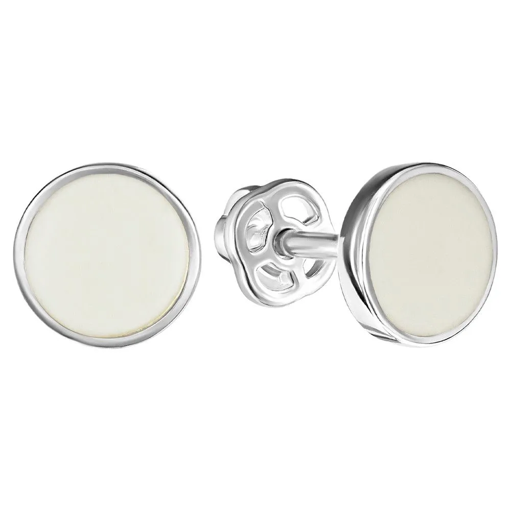 Серебряные серьги гвоздики (пусеты) с эмалью - цвет белый / Белый Родий. Средний вес ювелирного украшения 1.27 гр. Эмаль – холодная двухкомпонентная итальянская эмаль высокого качества. Имеет высокую степень устойчивости к царапинам и солнечному свету, ударам и механическим повреждениям.< /p> Все изделия собственного производства и имеют гарантию 12 месяцев. Арт. 8593WR.