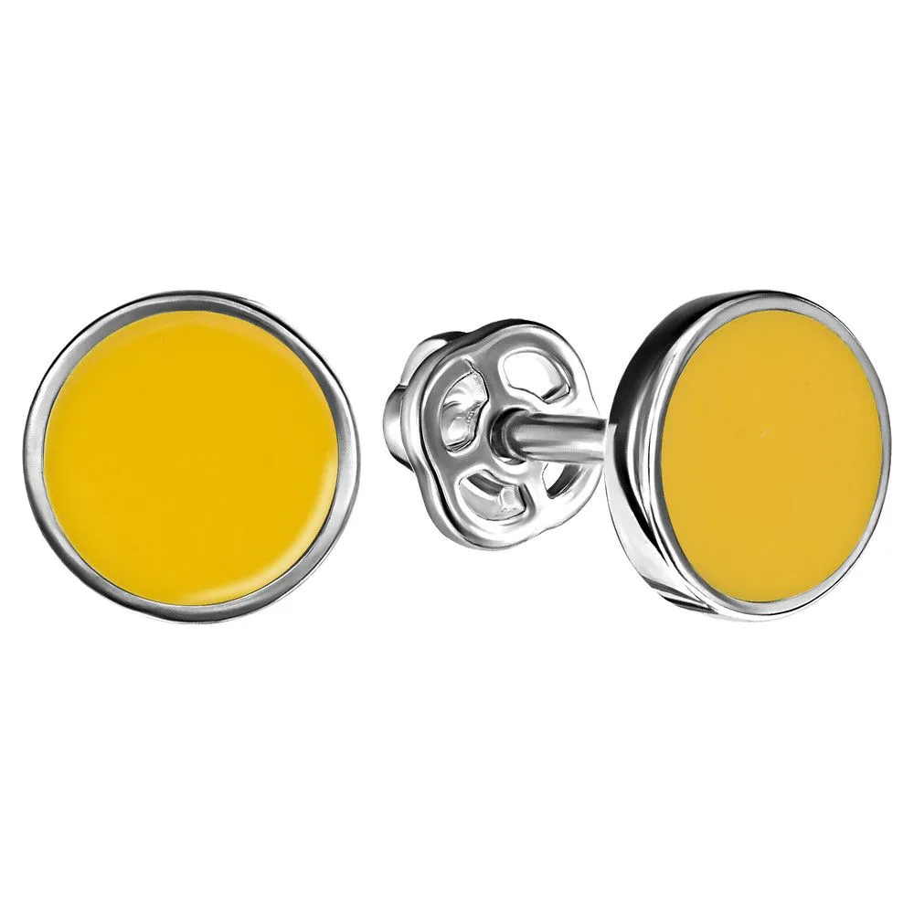 Серебряные серьги гвоздики (пусеты) с эмалью - цвет желтый / Палладий. Средний вес ювелирного украшения 1.27 гр. Эмаль – холодная двухкомпонентная итальянская эмаль высокого качества. Имеет высокую степень устойчивости к царапинам и солнечному свету, ударам и механическим повреждениям.< /p> Все изделия собственного производства и имеют гарантию 12 месяцев. Арт. 8594PD.