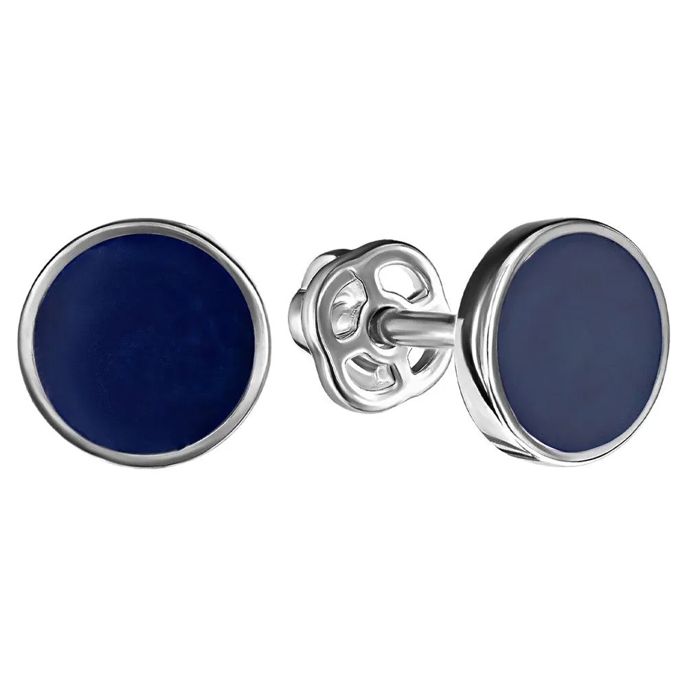 Серебряные серьги гвоздики (пусеты) с эмалью - цвет синий / Палладий. Средний вес ювелирного украшения 1.27 гр. Эмаль – холодная двухкомпонентная итальянская эмаль высокого качества. Имеет высокую степень устойчивости к царапинам и солнечному свету, ударам и механическим повреждениям.< /p> Все изделия собственного производства и имеют гарантию 12 месяцев. Арт. 8599PD.