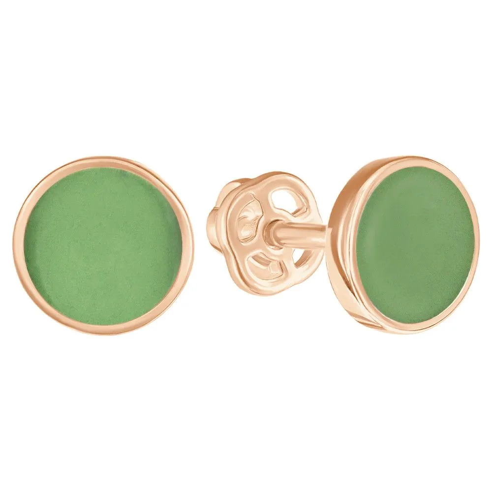 Серебряные серьги гвоздики (пусеты) с эмалью - цвет фисташковый / Красное золото. Средний вес ювелирного украшения 1.27 гр. Эмаль – холодная двухкомпонентная итальянская эмаль высокого качества. Имеет высокую степень устойчивости к царапинам и солнечному свету, ударам и механическим повреждениям.< /p> Все изделия собственного производства и имеют гарантию 12 месяцев. Арт. 8601RG.