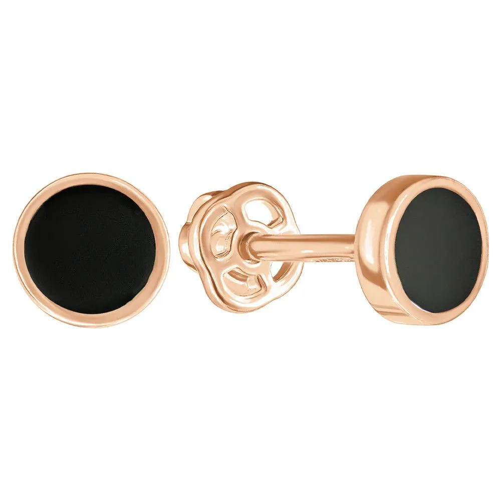 Серебряные серьги гвоздики (пусеты) с эмалью - цвет черный / Красное золото. Средний вес ювелирного украшения 0.86 гр. Эмаль – холодная двухкомпонентная итальянская эмаль высокого качества. Имеет высокую степень устойчивости к царапинам и солнечному свету, ударам и механическим повреждениям.< /p> Все изделия собственного производства и имеют гарантию 12 месяцев. Арт. 8608RG.